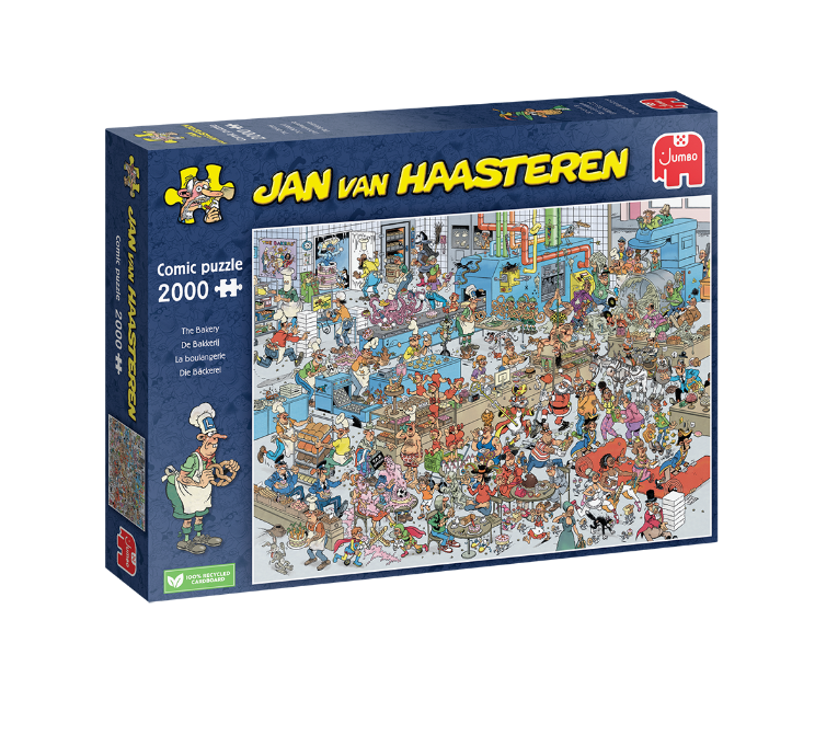Oplev komikerens tossede eventyr! Alle puslespil fra Jan van Haasteren er lavet af genbrugspap og er produceret i Europa.