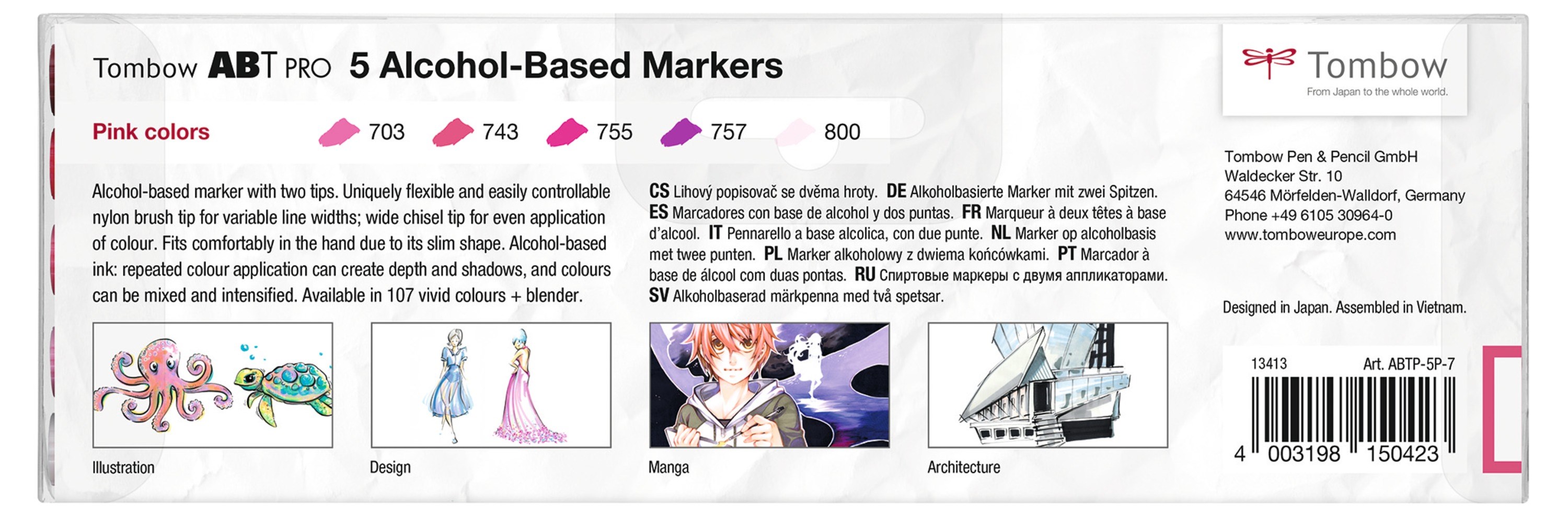 Den permanente blæk giver klare farver og stribefri dækning. Ved at tilføje ekstra farvelag, kan man øge dybder og skygger - og farverne kan blandes og intensiveres. ABT PRO kan bruges overalt, hvor der er behov for farveintensive og dynamiske illustrationer – f.eks. til manga og tegneserier, skitser, modedesign, produktudvikling, arkitektur og på mange andre områder.