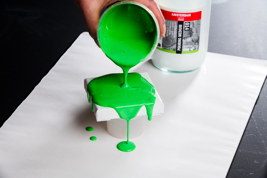 Pouring mediumet kan blandes med alle Amsterdam akrylfarver og akryl inks, og giver en smukt selvnivellerende effekt uden behov for ekstra værktøjer.