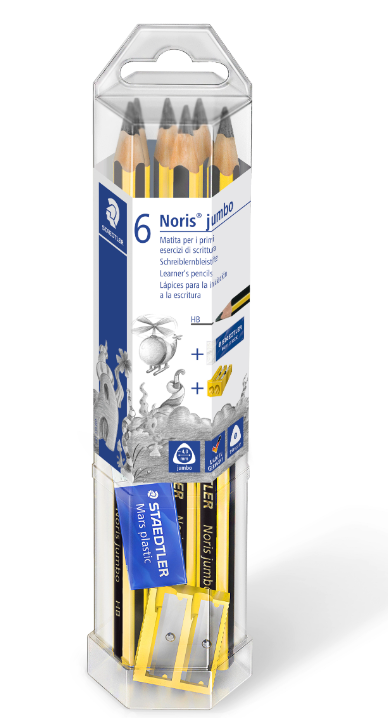 Praktisk sæt med 6 Jumbo blyanter, viskelæder og blyantspidser. Jumbo blyanten har trekantet, ergonomisk greb og et ekstra stærkt indre. Ideel til at skrive, tegne og skitsere med. Træet er fra certificerede, bæredygtigt forvaltede skove.