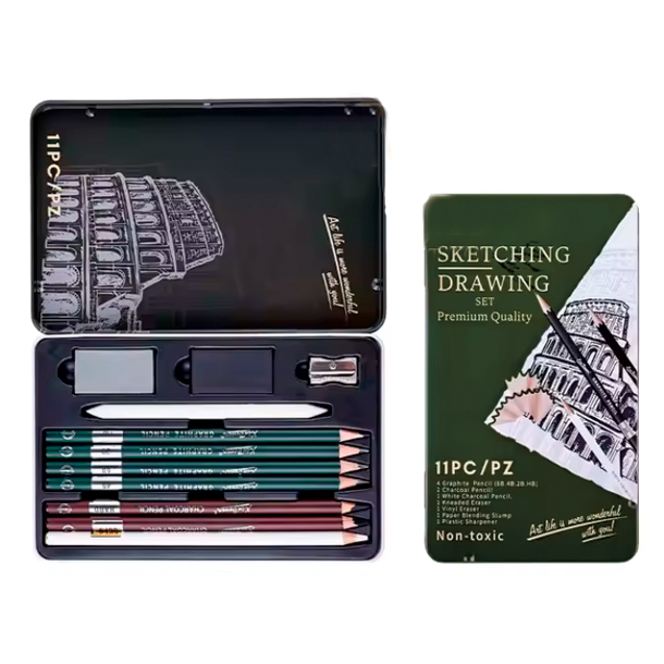 Løft dine tegnefærdigheder med dette komplette og alsidige 11-delte sketche-sæt i en elegant metalæske med kunstnerisk Colosseum-design. Uanset om du arbejder med præcise linjer eller mørke skygger, har dette sæt alt, du har brug for!