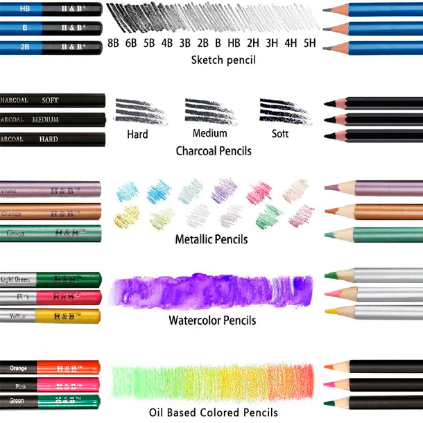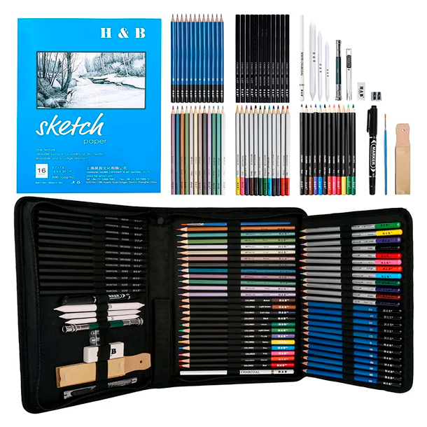 Med en kombination af blyanter, kul, akvarelblyanter, tilbehør og en praktisk skitsebog får du alt samlet i ét professionelt sæt.
