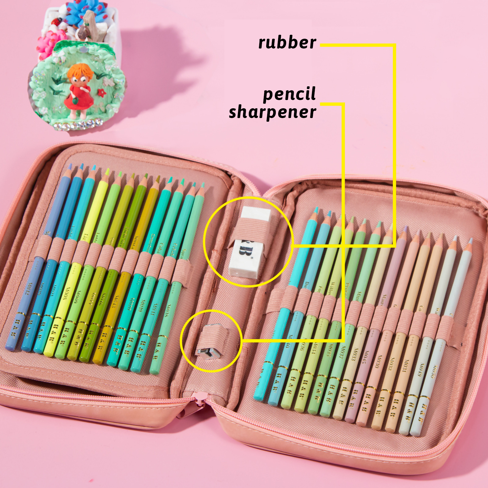 Ekstra tilbehør – indbygget viskelæder (rubber) og blyantspidser (pencil sharpener), så du altid har det nødvendige værktøj ved hånden.