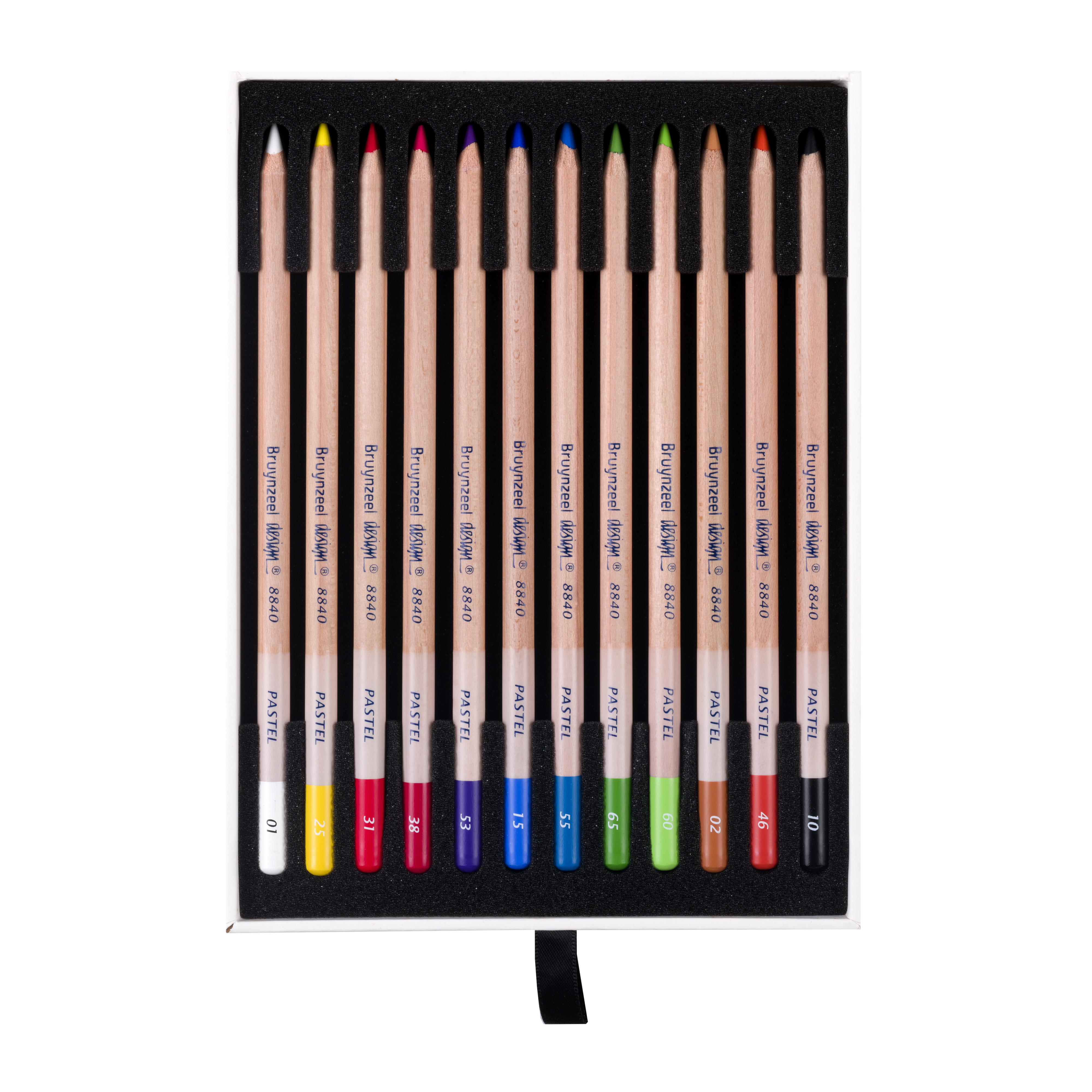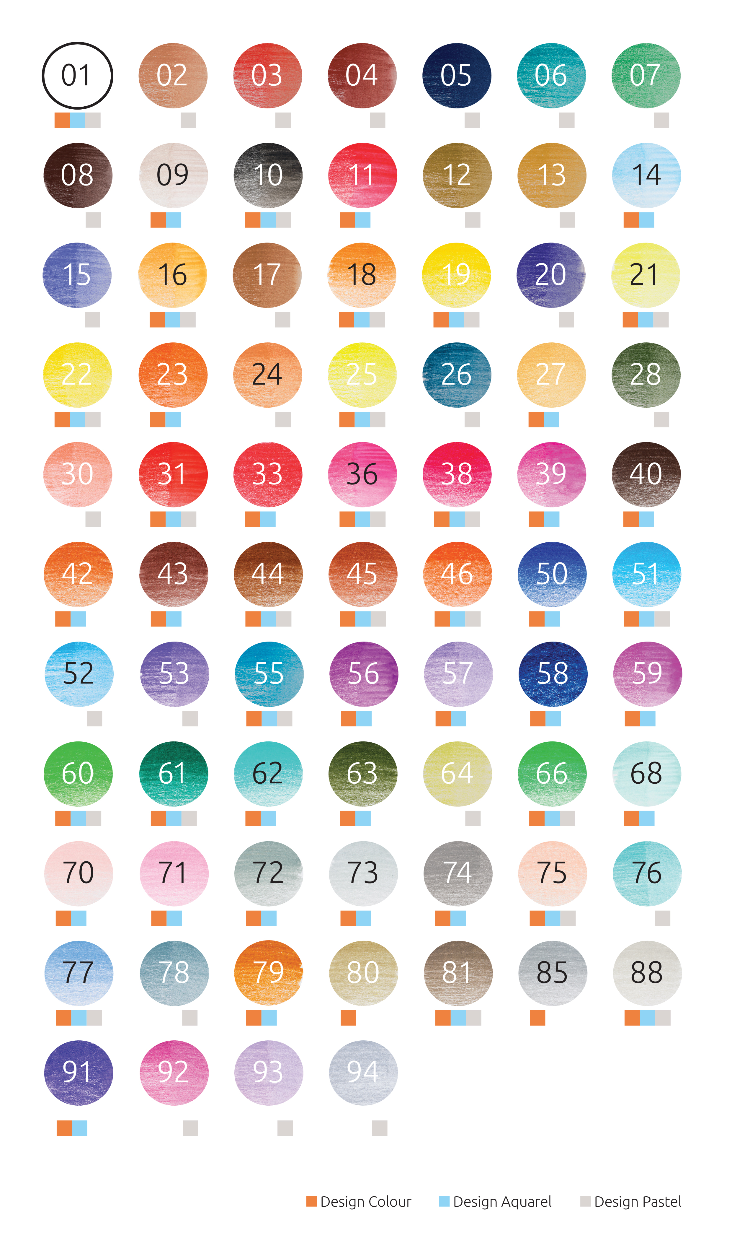 01 Hvid, 25 Citron Gul, 31 Vermilion, 38 Karminrød, 53 Violet, 15 Ultramarin, 55 Koboltblå, 65 Æblegrøn, 60 Lys Grøn, 02 Brun, 46 Sienna, og 10 Sort.