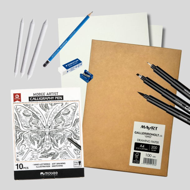 Tegnepapir, paperstumps, kalligrafituscher, viskelæder, Blyant, Blyantspidser