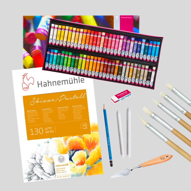 Velour Pastelblok, Tape, Fixativ, Blyant, Paperstumps, Viskelæder & Oliepasteller