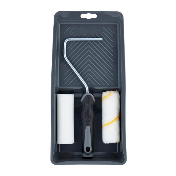 Sættet indeholder en malerbakke i slidstærk plast med rillet overflade, som gør det nemt at fordele malingen jævnt på rullen og reducerer dryp og spild. Bakken er let og har en praktisk størrelse, der er nem at håndtere både på bordplader og på stilladser eller stiger.