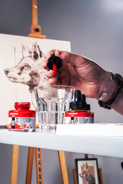 Amsterdam Akryl Ink fungerer på en lang række overflader som papir, karton, lærred, træ og flere porøse materialer – og kan uden problemer kombineres med Amsterdam akrylmaling, spray, markers og medier.