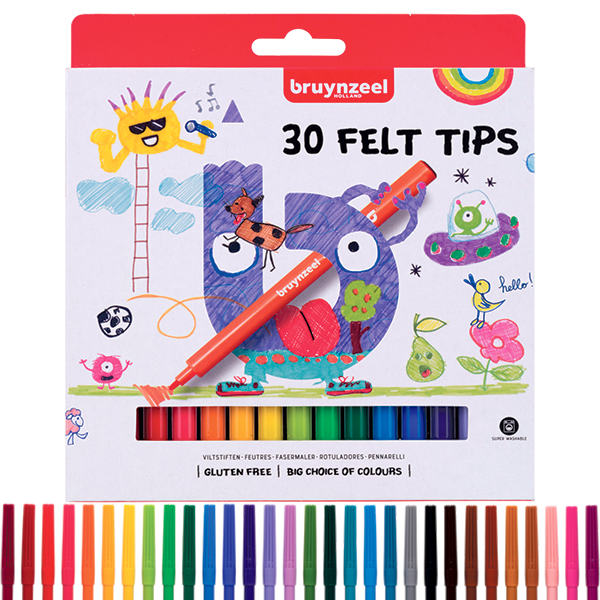 Bruynzeel 30 Felt Tips støtter udviklingen af finmotorik, farveforståelse og kreativitet.