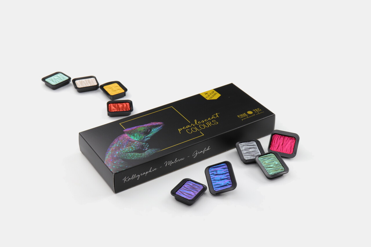 FINETEC akvarelkollektionen består af en række perleskimrende, iriserende og Flip-Flop farver, alle lavet med etisk fremskaffet naturlig glimmer eller syntetiske substrater, der giver en smuk glans.