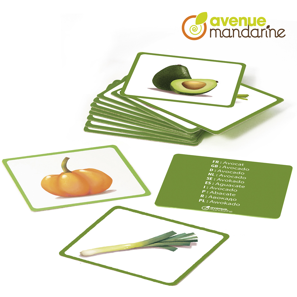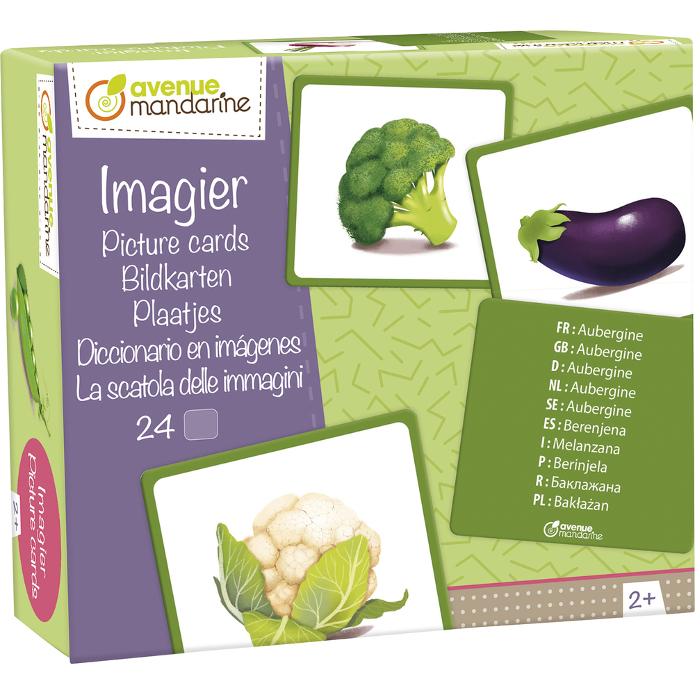 Billede kortene i æsken bruges til at træne sprog og ordforråd ved børn. Denne æske er med billeder af grøntsager.