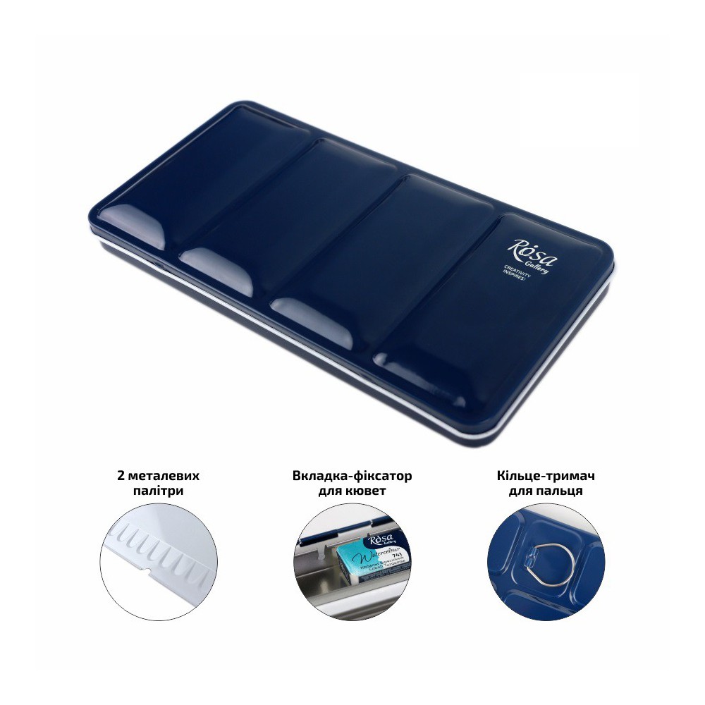 ROSA Gallery akvareletuier er designet med kunstnerens behov i fokus. Disse metaletuier inkluderer to paletter i forskellige konfigurationer, hvilket gør dem alsidige og funktionelle. En speciel indsats sikrer, at brikkerne sidder fast og stabilt, mens den praktiske fingerholder i bunden af etuiet gør det nemt at holde kassen sikkert i hånden, selv under længere arbejdsperioder.