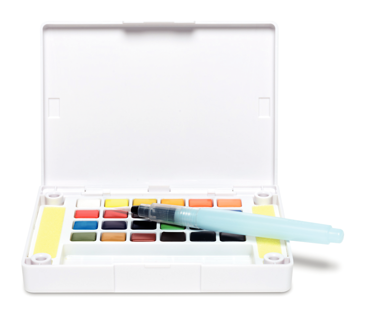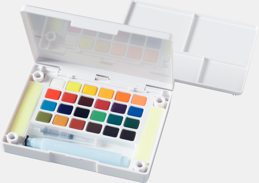 Sættet kommer med 24 farver, to svampe, blandingsbakker i låget så du kan blande dine egne farver og en waterbrush.