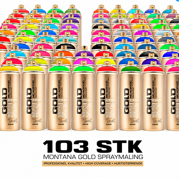 Montana Gold set indeholder hele 103 spraydåser med én af hver farve i vores komplette Montana Gold-sortiment. Sættet inkluderer både standardfarver, transparente, chrome- og neonfarver, så du får det fulde udvalg samlet i én pakke.