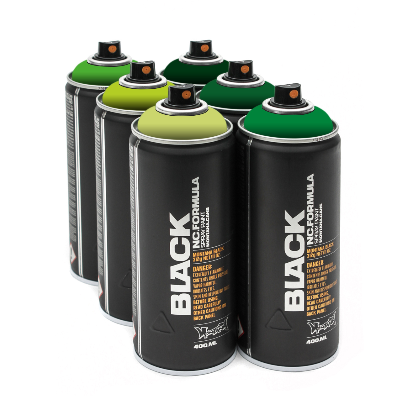 Green set fra Montana cans med 6 farver; 1 x spring, 1 x wild lime, 1 x irish green, 1 x boston, 1 x celtic & 1 x banknote.
