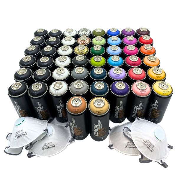 Montana Black set indeholder 4 støvmasker & 50 spraydåser; 12 sort, 6 hvid, 1 sølv, 1 guld, 1 kobber, 2 rød, 2 gul, 2 orange, 2 brun/beige, 4 pink, 4 lilla, 4 grå, 4 grøn & 5 blå.