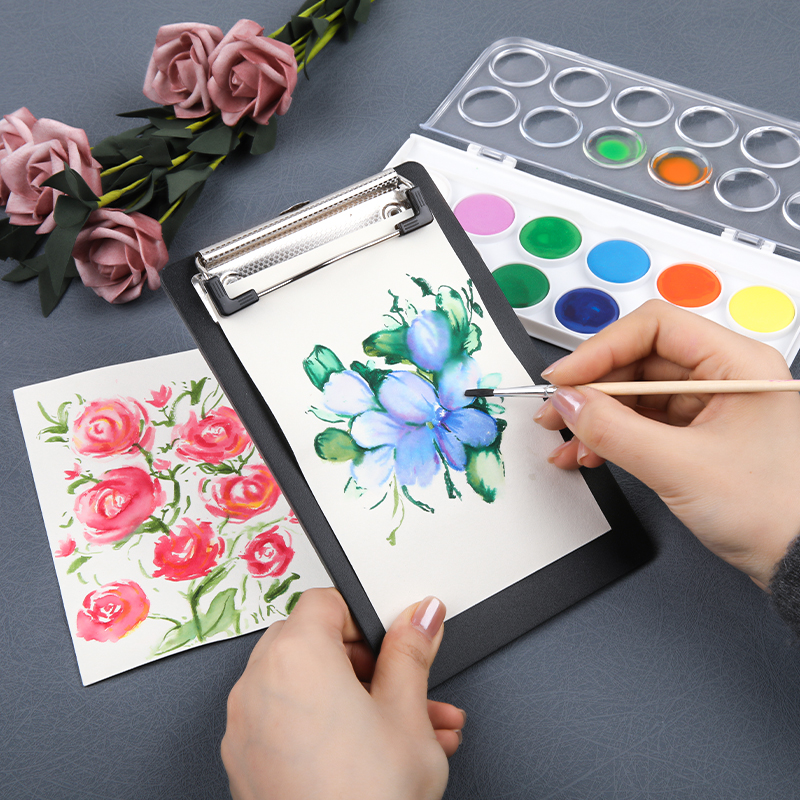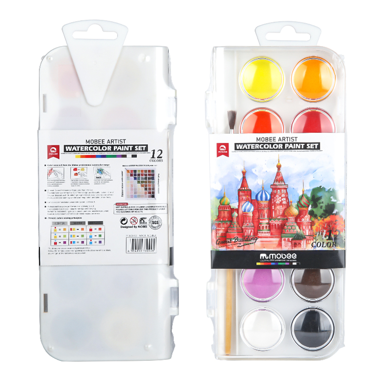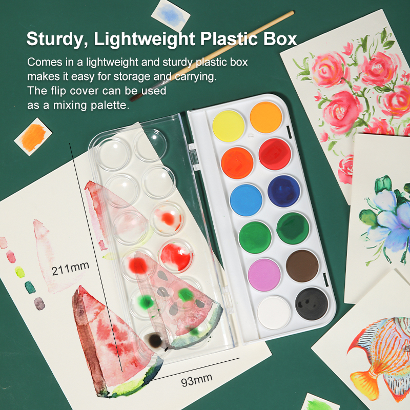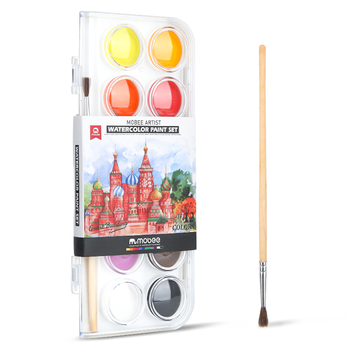 Mobees akvarelsæt kommer i et praktisk plastiketui med et gennemsigtigt låg, der beskytter farverne og gør det nemt at holde overblik over dine nuancer.