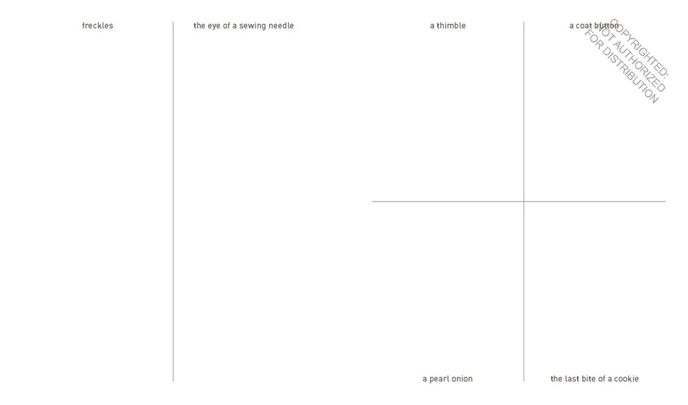 Denne lille bog indeholder 642 tegnemotiver, der alle har én ting til fælles: de er bittesmå. Du bliver bedt om at tegne alt fra et nøglehul, en glaskugle og et atom til dit hus set fra rummet. Nogle opgaver virker enkle (prøv bare at tegne et græsstrå), andre er tankevækkende og mere abstrakte (hvordan tegner man lysets hastighed?), mens nogle er helt enkle og genkendelige (et viskelæder, en knap, Karlsvognen).
