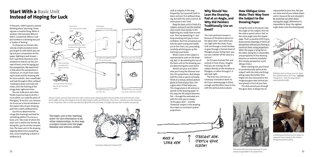 Bogen bygger på en enkel, men effektiv filosofi: at tegning handler mere om at observere rigtigt end om at kunne føre en blyant. Gennem en række øvelser, teknikker og visuelle eksempler lærer du at skærpe dit blik, forstå former, lys og skygge, og omsætte dine observationer til sikre streger på papiret.