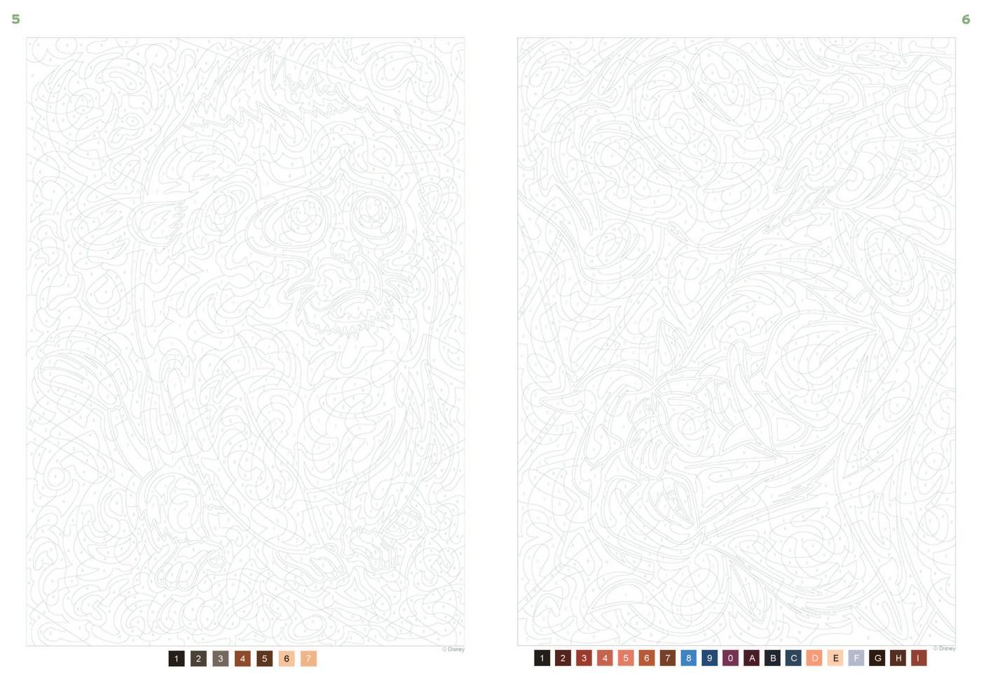 Hver illustration afsløres gradvist, når du farvelægger efter de medfølgende farvekoder. Det er en afslappende og kreativ måde at genopleve de uforglemmelige øjeblikke med Disney og Pixars mest charmerende og mindeværdige dyr.