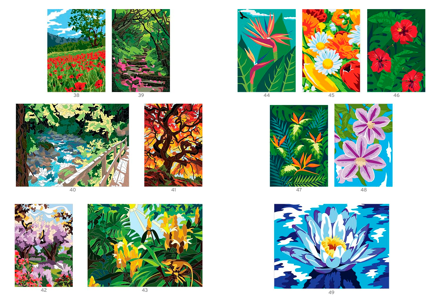 Mal flotte natur, blomster og fugle og mere i denne paint-by-numbers malebog.
