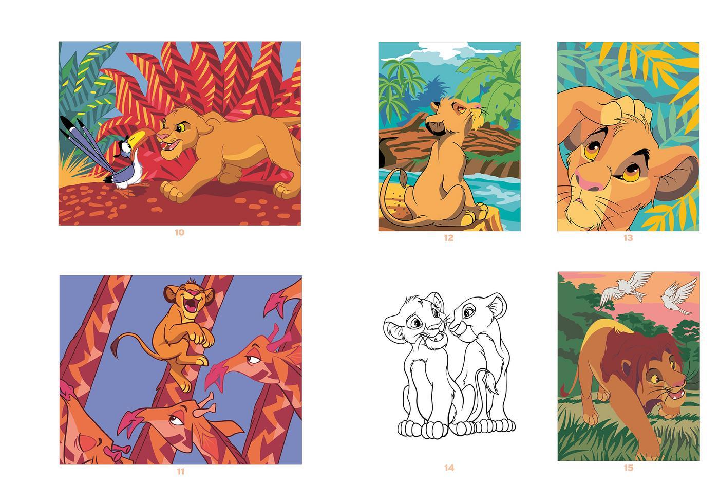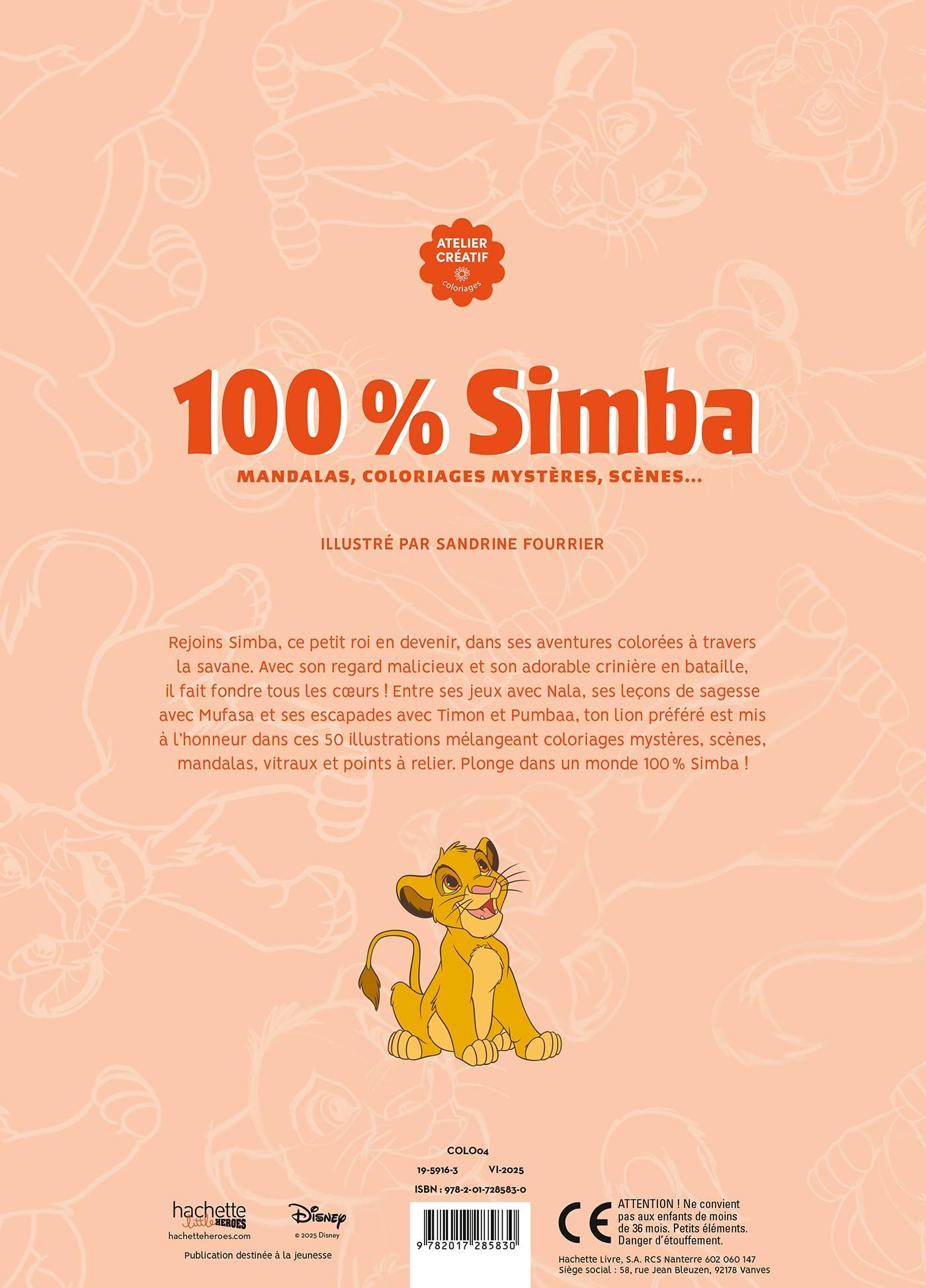 Tag med Simba, den lille løveprins på vej mod sin skæbne som konge, på farverige eventyr gennem savannen. Med sit drilske blik og sin pjuskede, charmerende manke smelter han alles hjerter. Oplev hans legende stunder med Nala, de kloge livslektioner fra Mufasa og de sjove påfund sammen med Timon og Pumbaa. I denne samling hyldes din yndlingsløve gennem 50 illustrationer, der byder på en skøn blanding af farvelæg-efter-tal, klassiske motiver, mandalaer, vinduesglasdesigns og prik-til-prik-tegninger. Dyk ned i et univers dedikeret 100 % til Simba.