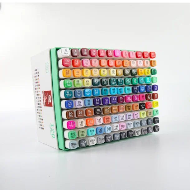 Denne pakke indeholder hele 120 forskellige farver, der dækker et bredt spektrum af nuancer – perfekt til alt fra levende farvelægning til subtile overgange og skygger.
