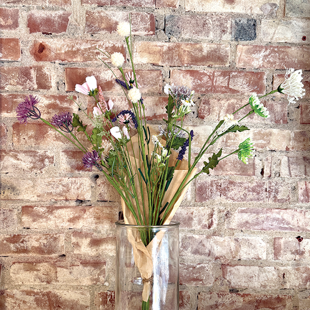 Denne kunstige buket er skabt med et let, vildtvoksende udtryk, der minder om en nyplukket markbuket.