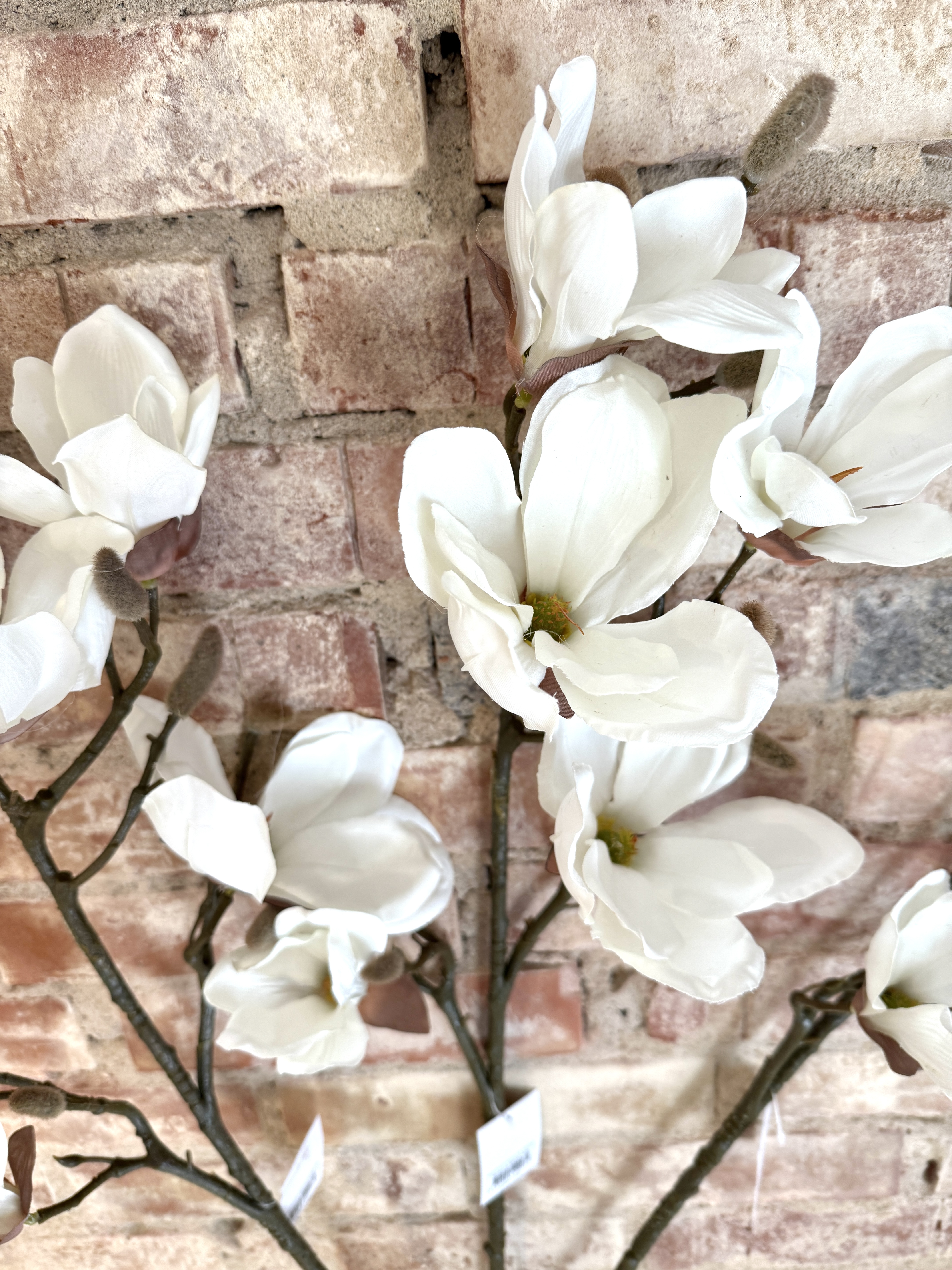Denne kunstige magnoliagren er en elegant og naturtro dekoration med store, hvide blomster og fine knopper, der giver et eksklusivt og roligt udtryk.