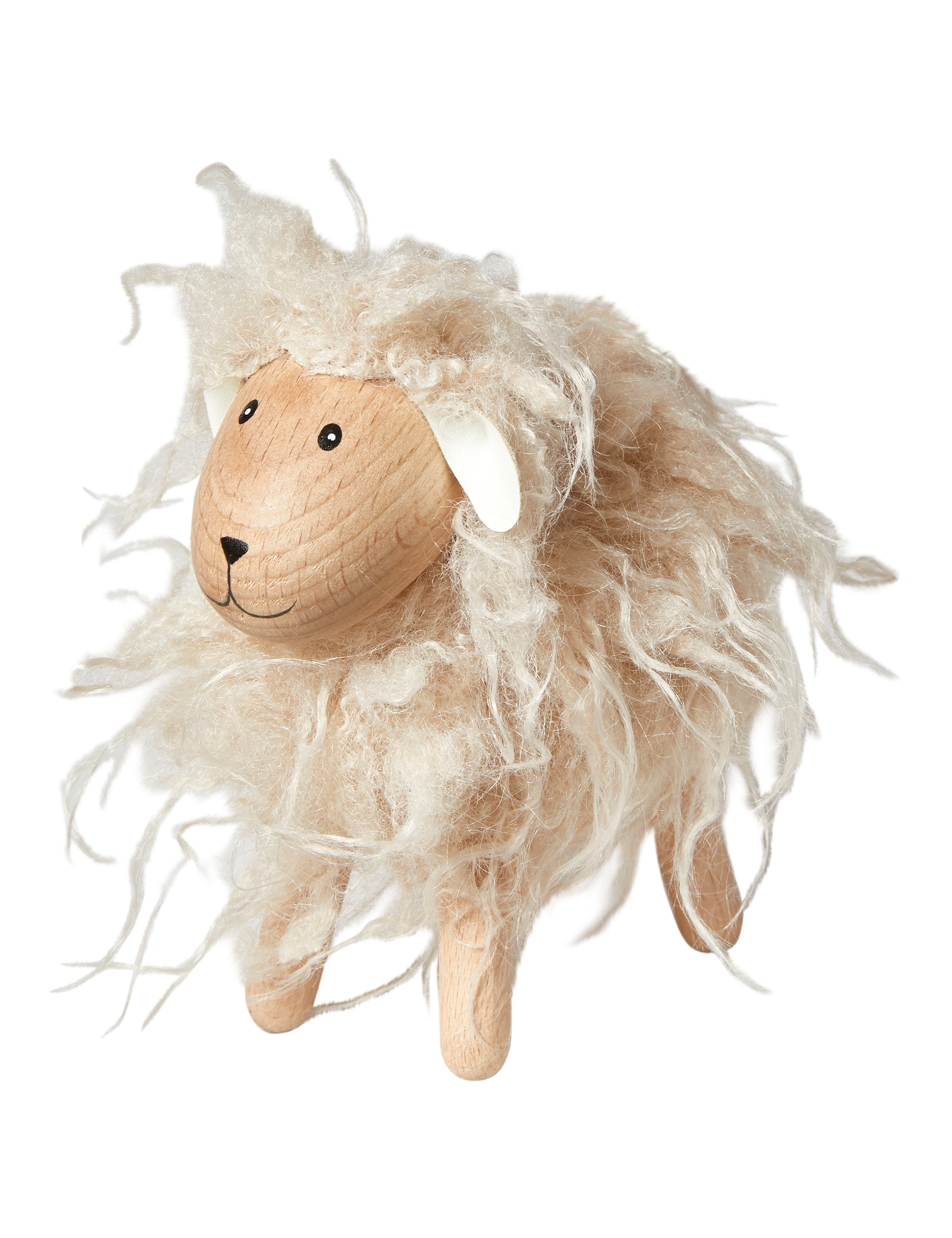 Fåret er fremstillet med hoved og ben i bøgetræ, hvilket giver et naturligt og varmt udtryk, mens pelsen er lavet af polyester og har et let krøllet og fluffy look, der gør figuren ekstra charmerende.