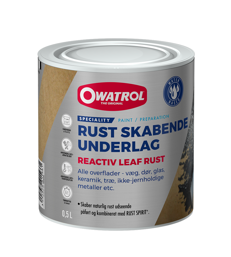 REACTIV LEAF RUST er en specialudviklet grunder med ægte jernpartikler, som gør det muligt at skabe en autentisk rustfinish på overflader, der normalt ikke ruster. Malingen er vandbaseret og lugtfri og kan anvendes på mange materialer som træ, glas, keramik og ikke-jernholdige metaller.