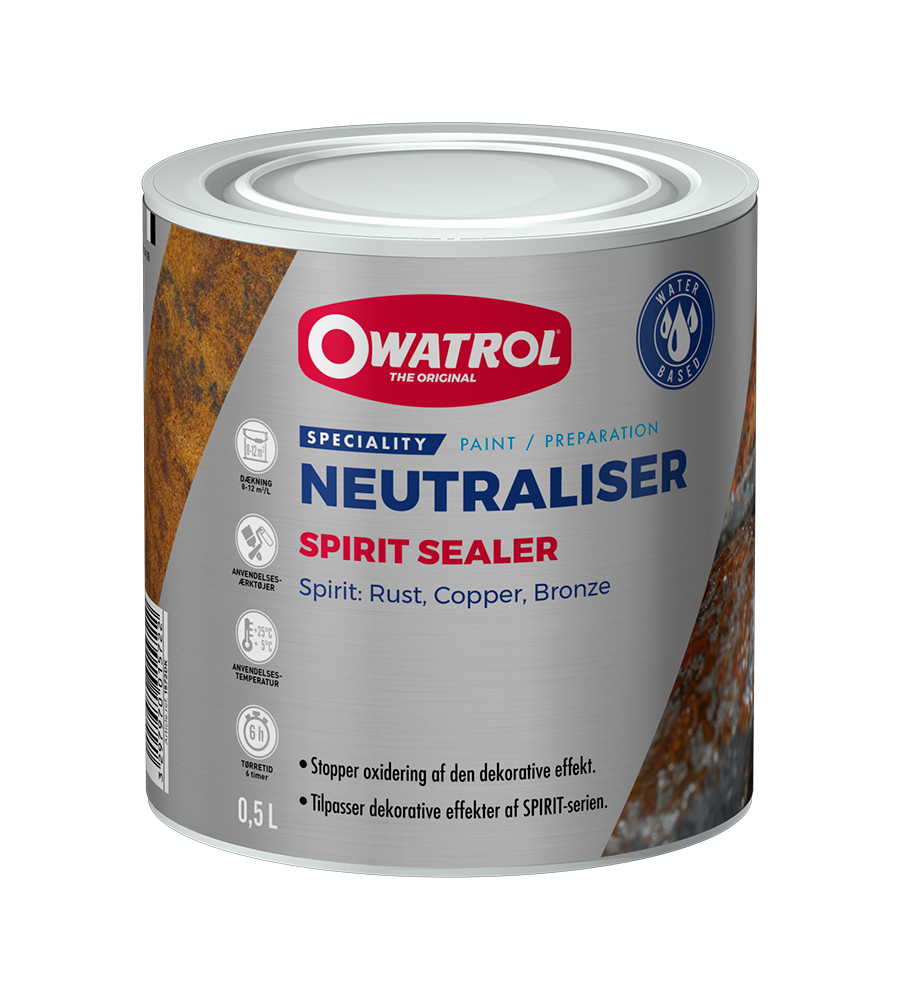 SPIRIT SEALER er en vandbaseret og lugtfri forsegler til indendørs brug, som anvendes til at neutralisere og stoppe oxidationsprocessen på dekorative overflader. Når den ønskede effekt er opnået med RUST SPIRIT, COPPER SPIRIT eller BRONZE SPIRIT, bruges SPIRIT SEALER til at fastholde resultatet og beskytte overfladen mod yderligere forandringer.