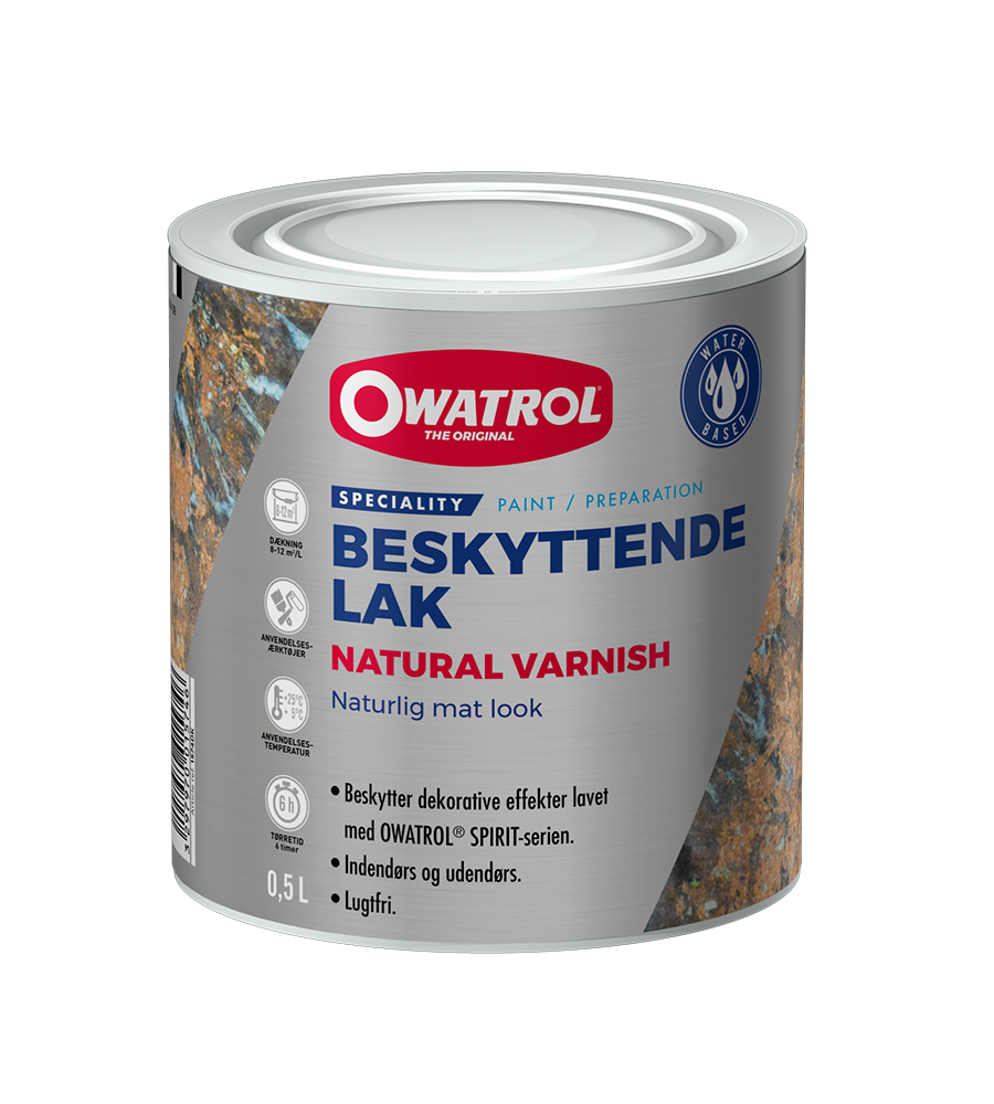 NATURAL VARNISH er en vandbaseret og lugtfri mat lak, udviklet til at beskytte og bevare de dekorative effekter, der er skabt med produkter fra SPIRIT-serien. Lakken danner en slidstærk, mat overflade, som fastholder udtrykket uden at ændre farver eller patina.