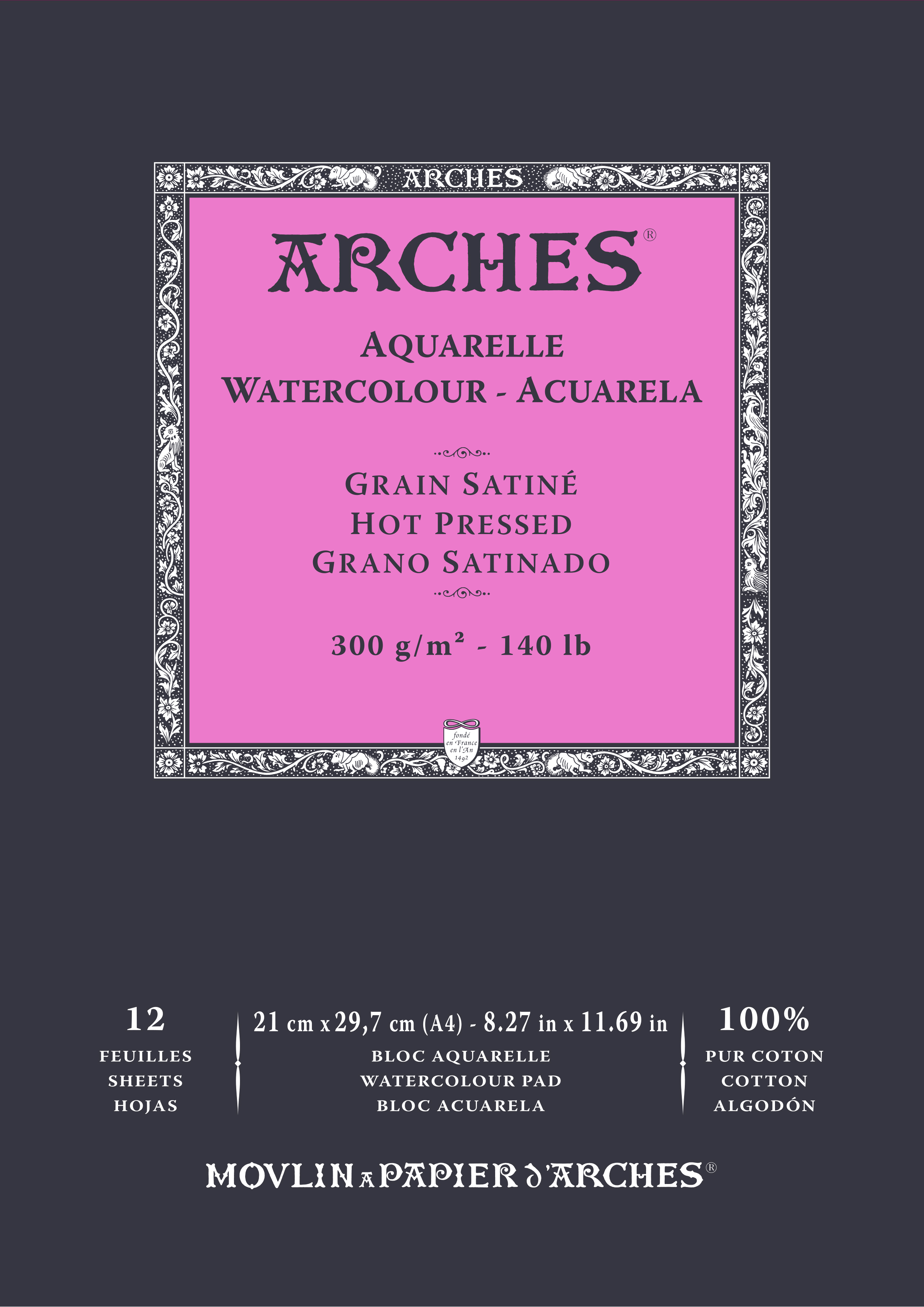 Arches varmpresset akvarelblok GS, Grain Satiné, 300gsm, Archers akvarelpapir med et fiberindhold på 100% bomuld, syrefrit og pH-neutralt. Fremstillet med naturlig gelatinedimensionering og lufttørret.