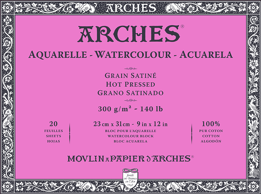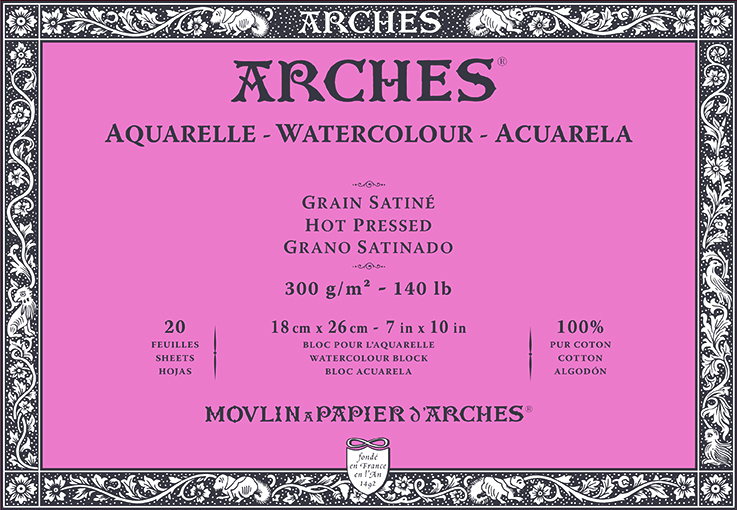 Arches akvarelblok i højeste kvalitet, lavet af 100% bomuld med en grov struktur og en vægt på 300 gsm. Papiret er syrefrit, ældningsbestandigt, gelatinebelagt og lufttørret for at sikre optimal holdbarhed og bevarelse af dine kunstværker.