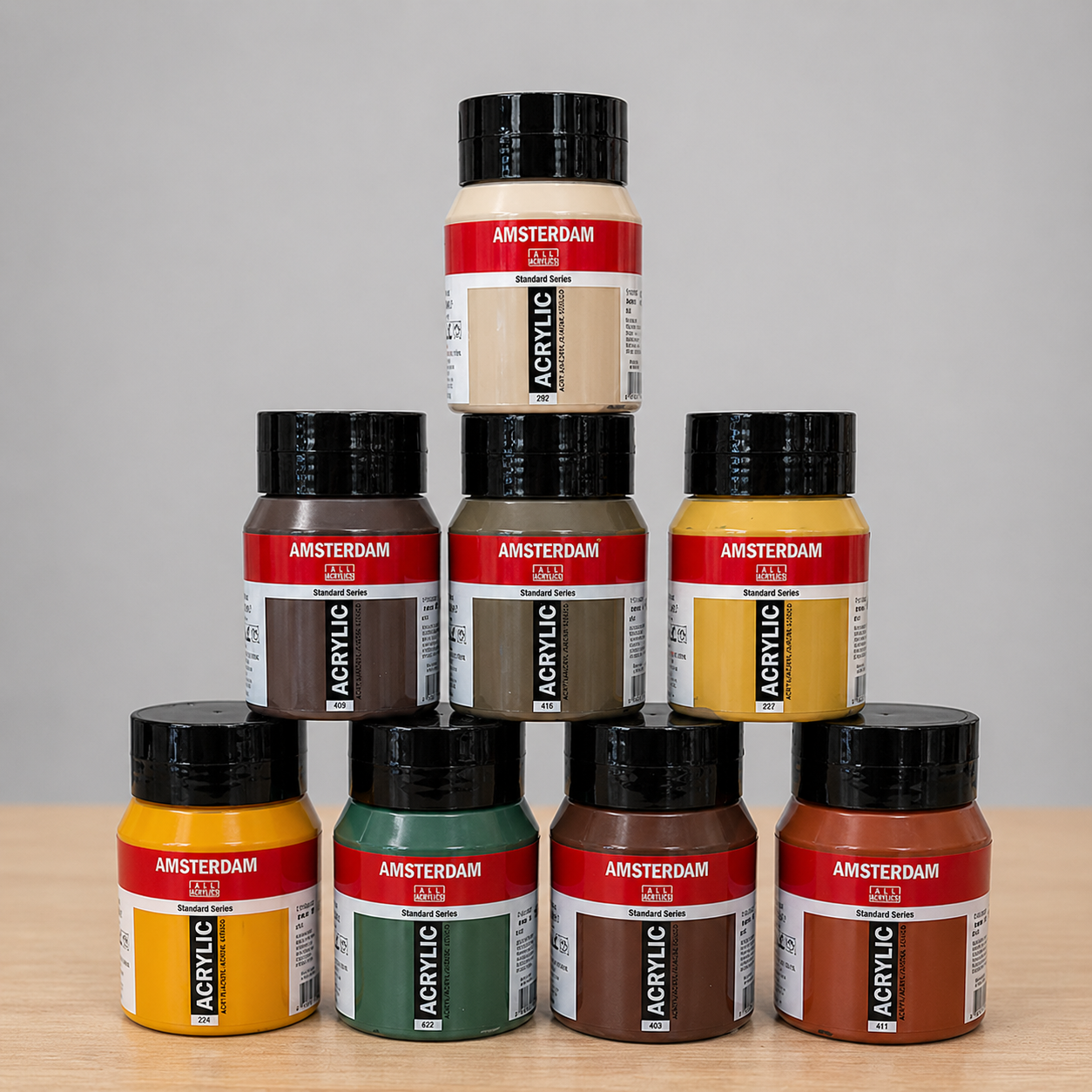 Amsterdam-sæt med otte flotte jordfarver, nøje udvalgt til at skabe varme nuancer, naturlig dybde og harmoniske farvekombinationer. Perfekt til både hobbybrug, kunstprojekter og dekorative opgaver.