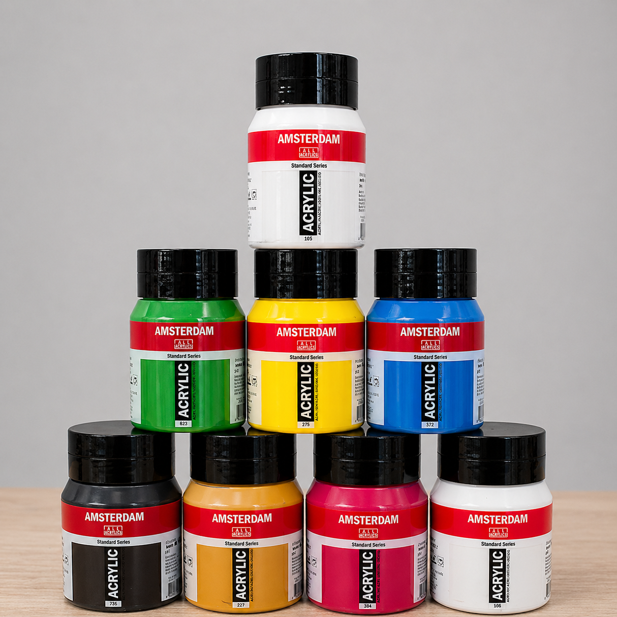 Amsterdam-sæt med otte flotte basisfarver, nøje udvalgt til at skabe alsidige farvekombinationer og et solidt grundlag til enhver kreativ opgave. Perfekt til både hobbybrug, kunstprojekter og dekorative opgaver.