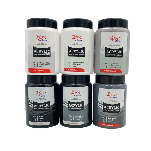 401 - Titanium White, 408 - Zinc White, 403 - Black, 444 - Warm Gray, 445 - Deep Grey, 454 - Paynes Grey