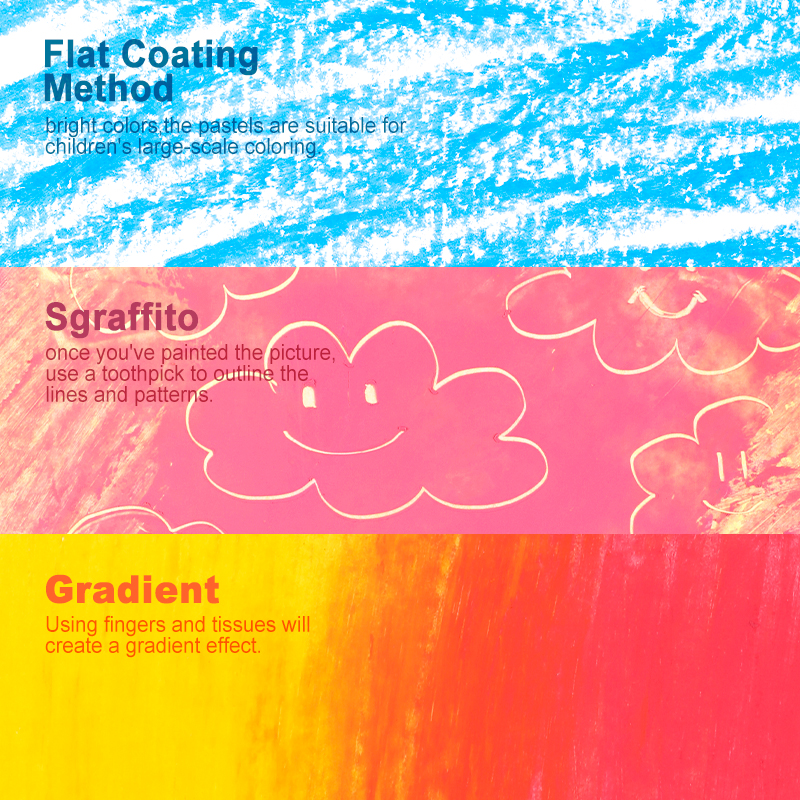Pastellerne er fremstillet af ikke-giftige kvalitetsmaterialer og er udviklet med høj pigmentering for klare og holdbare farver.