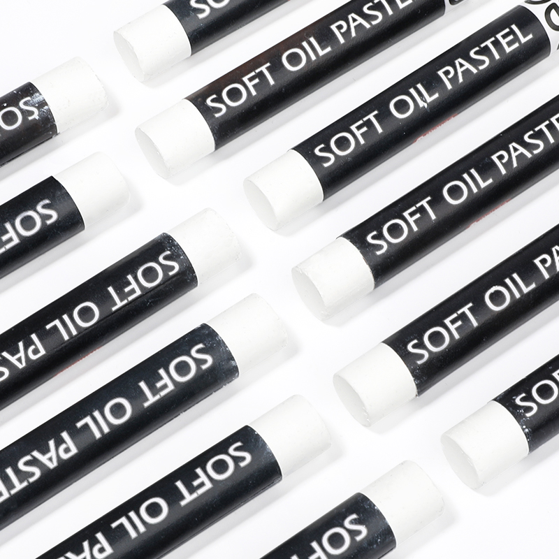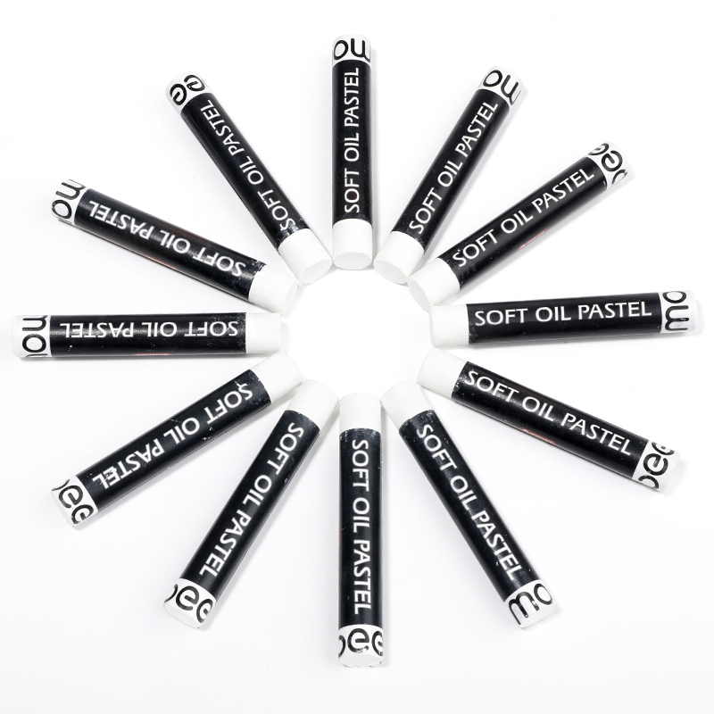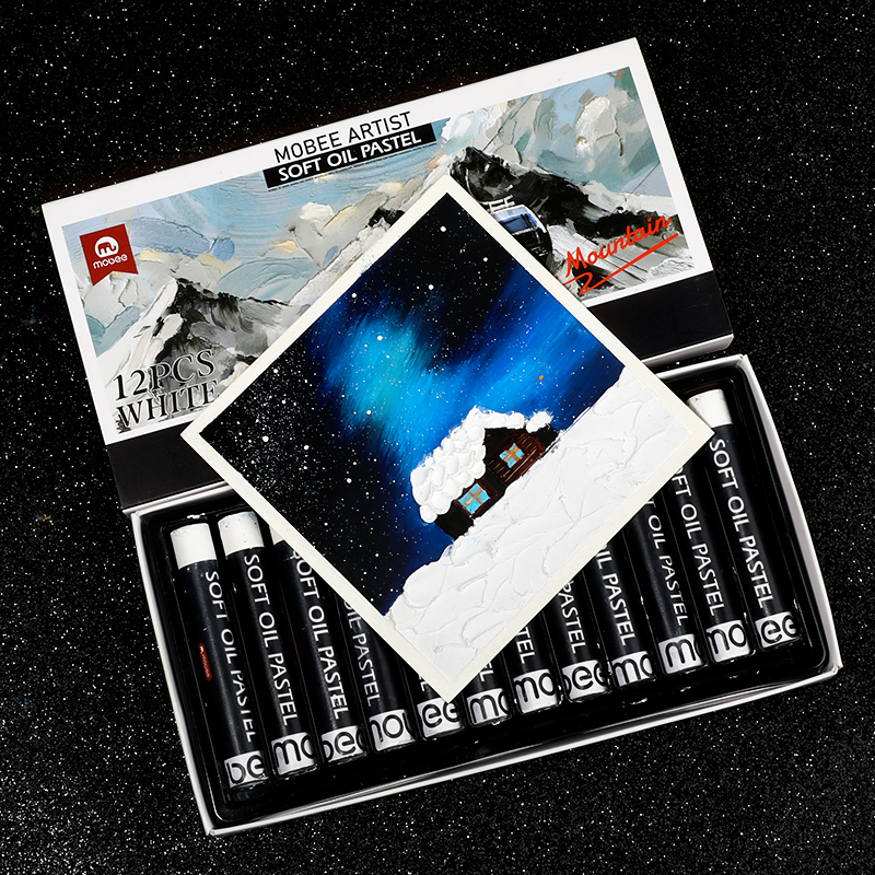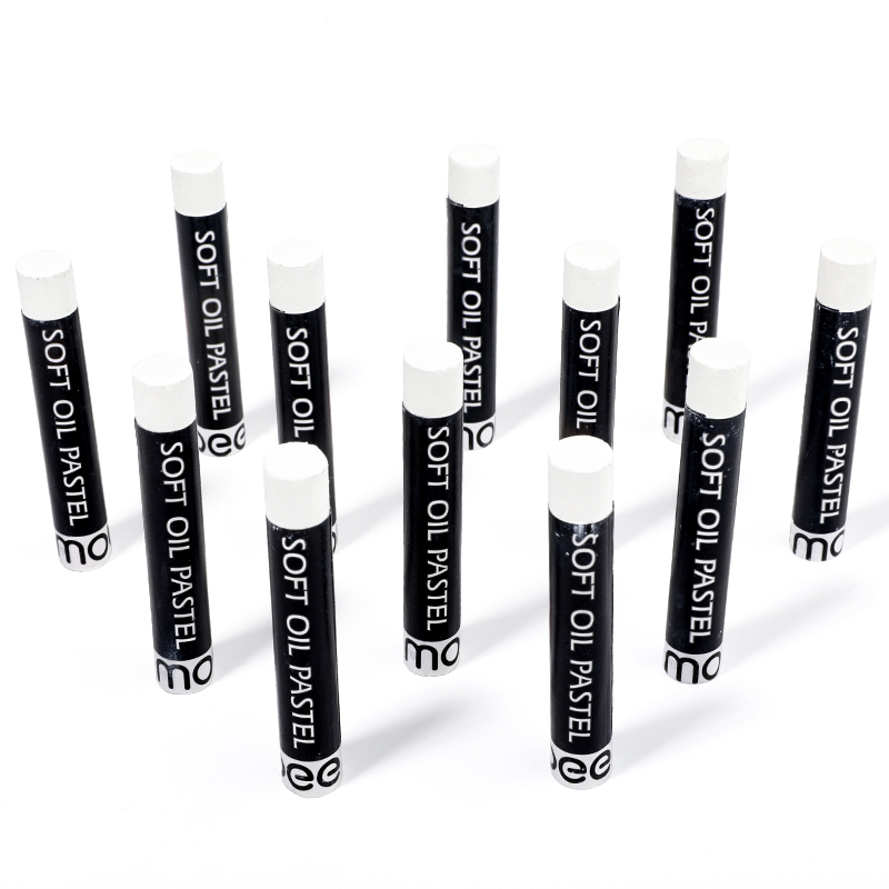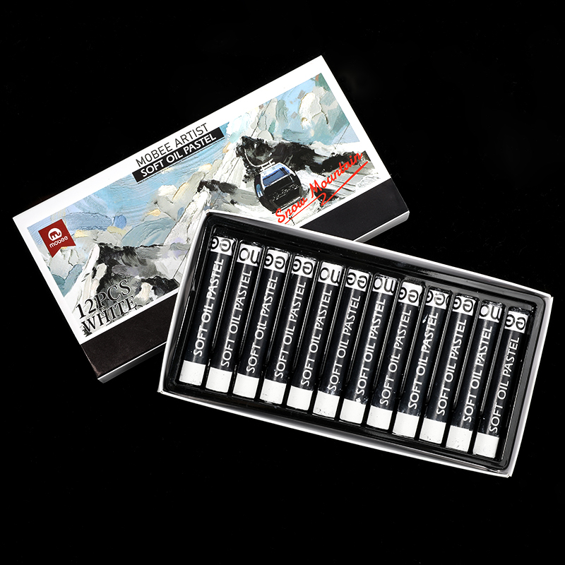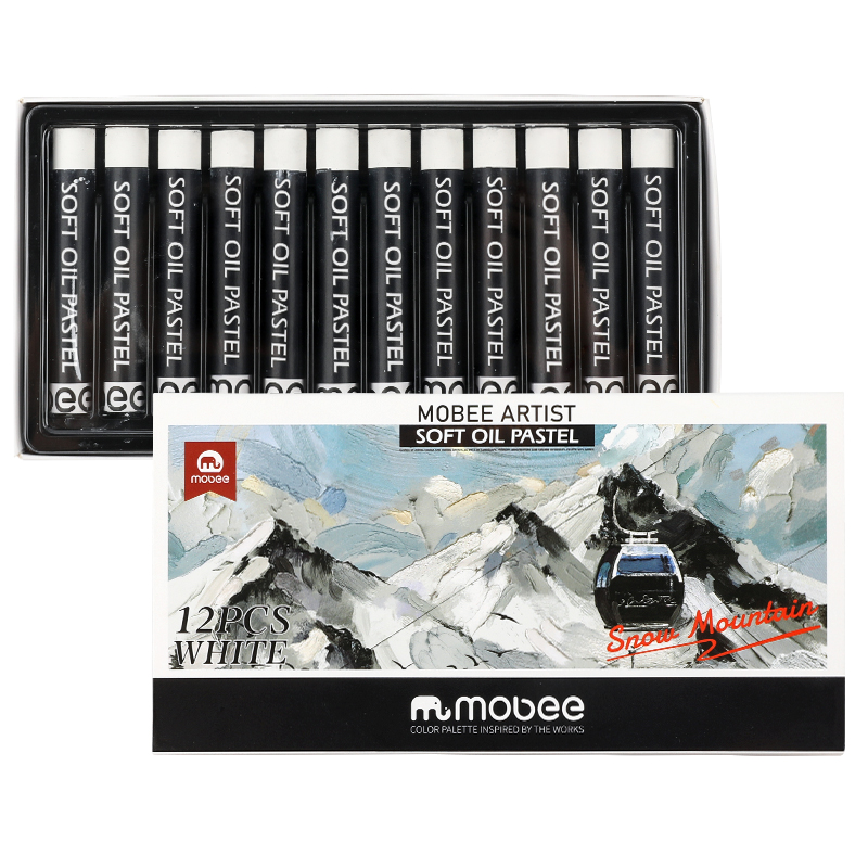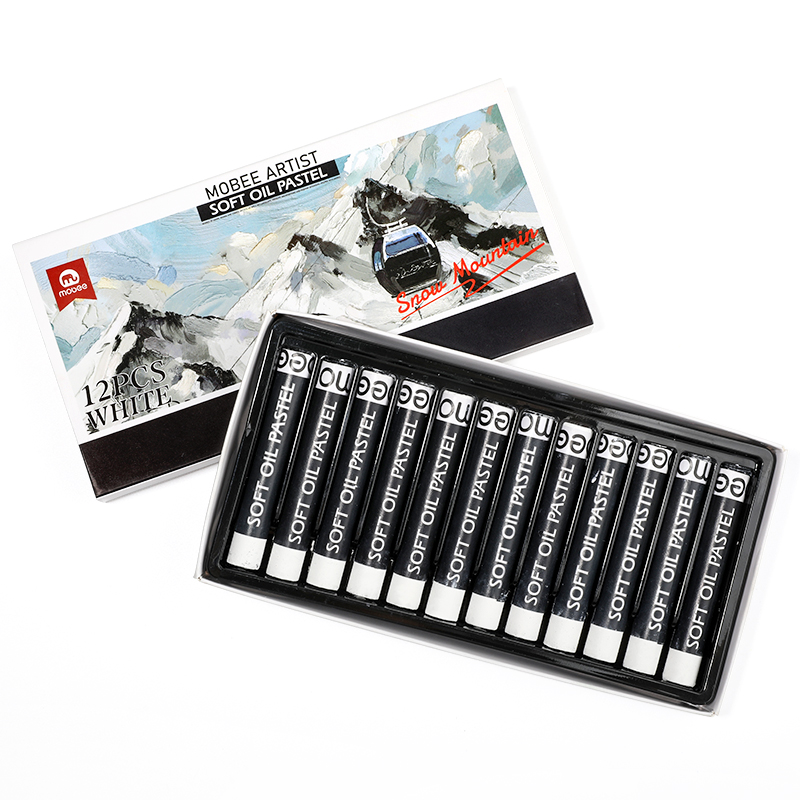 Denne æske indeholder tolv hvide oliepasteller fra Mobee, fremstillet til kunstnere, der ønsker høj dækkeevne og blød farvelægning.