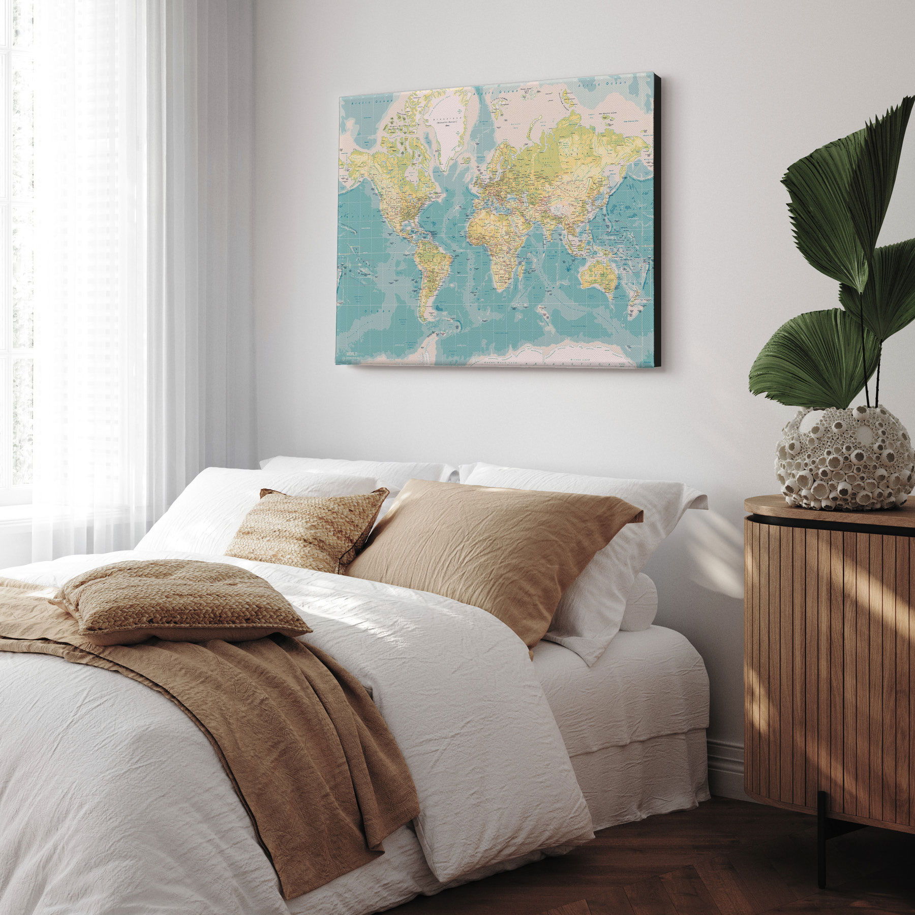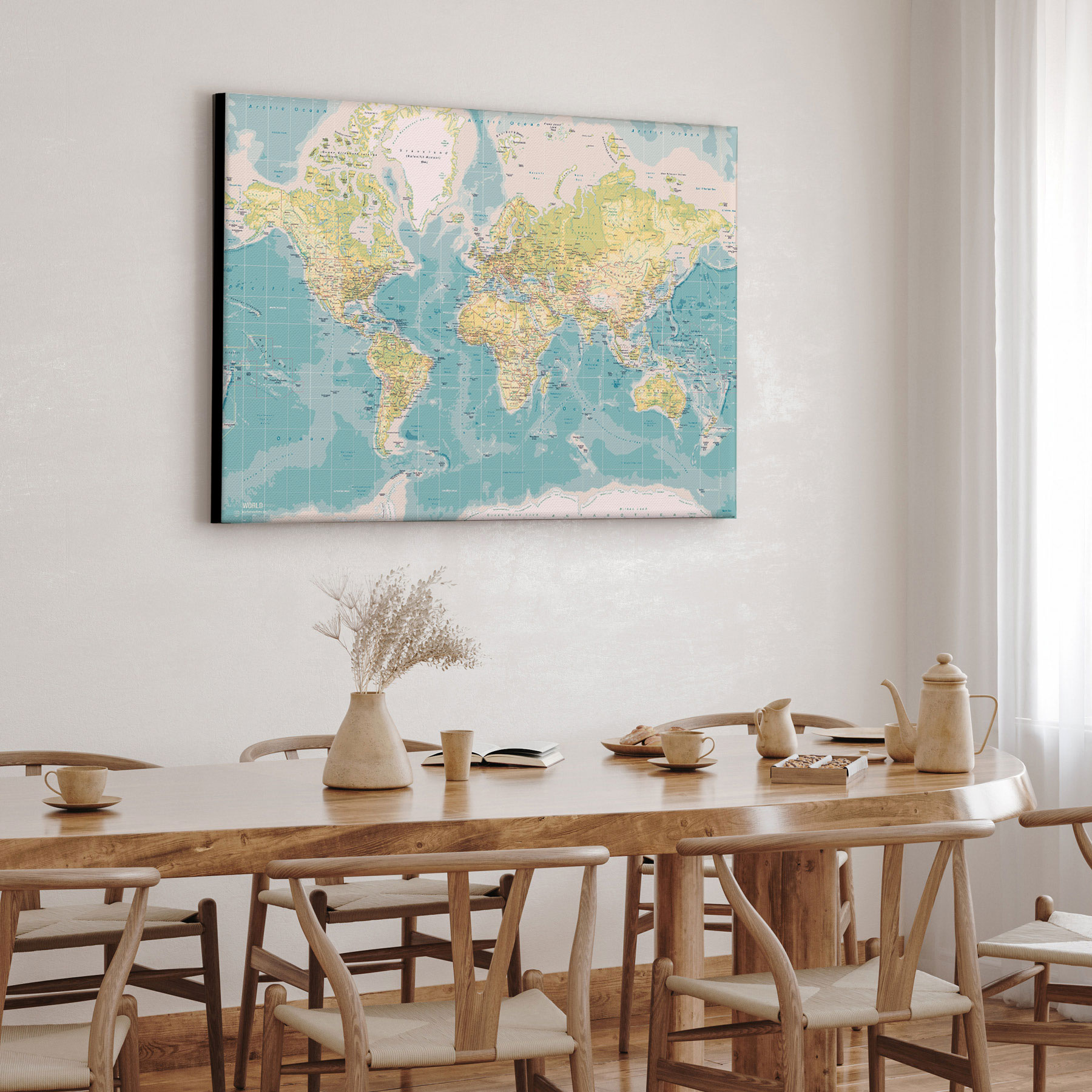 Rejs tilbage i tiden med dette "Retro" verdenskort som lærredstryk, der kombinerer klassisk kortdesign med et nostalgisk farveudtryk. De varme, afdæmpede gule og grønne nuancer på landmasserne skaber en autentisk vintage-fornemmelse, mens havene fremstår i bløde blå toner, der giver en harmonisk balance. De detaljerede landegrænser og præcise geografiske markeringer gør kortet både dekorativt og informativt – perfekt til historieelskere, eventyrere eller som en stilfuld vægdekoration. Trykt på kvalitetslærred og opspændt på en solid blindramme, så det er klar til ophæng.