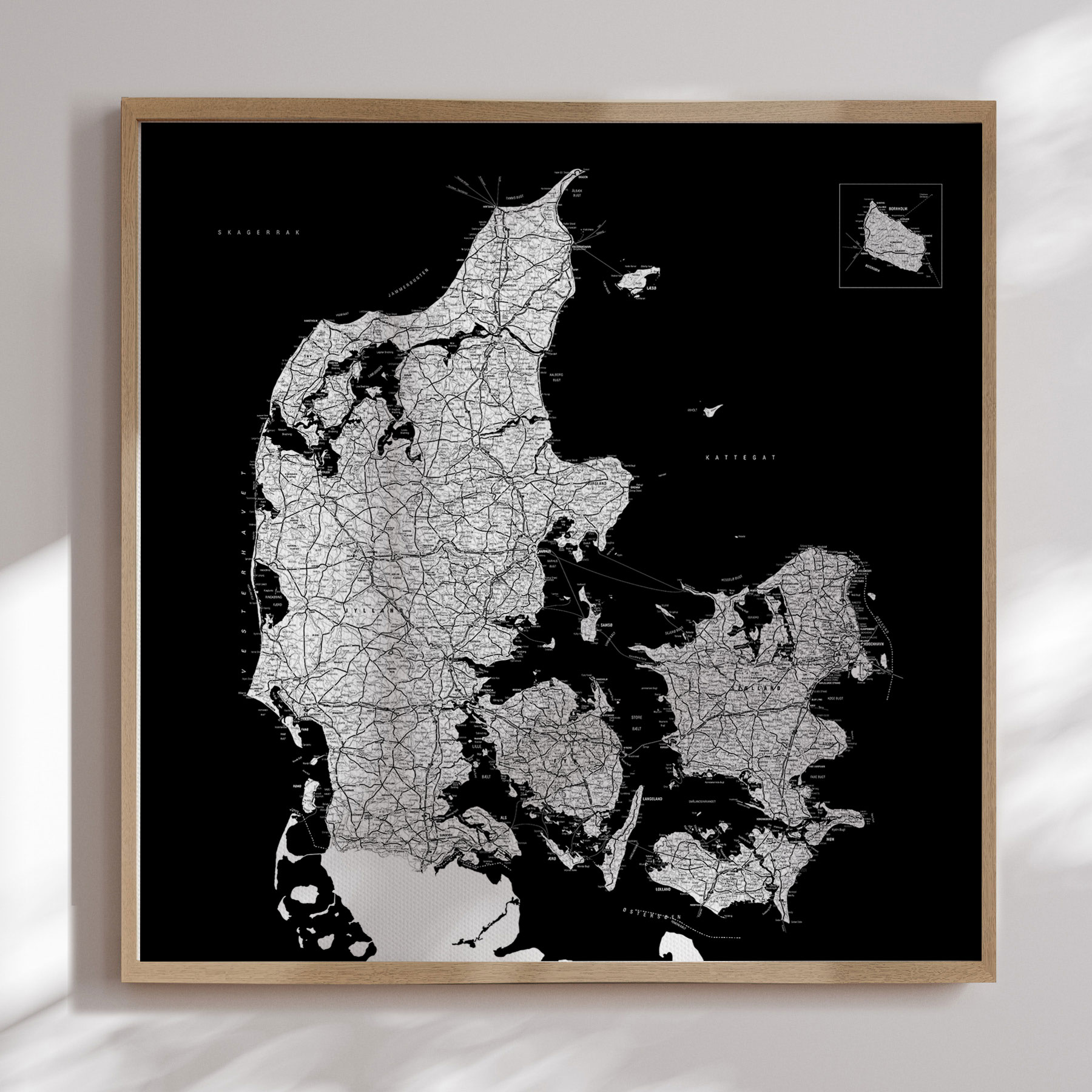 Dette stilfulde og detaljerede Danmarkskort er designet i en minimalistisk sort-hvid farvepalette, der fremhæver landets veje, byer og geografi på en elegant måde.