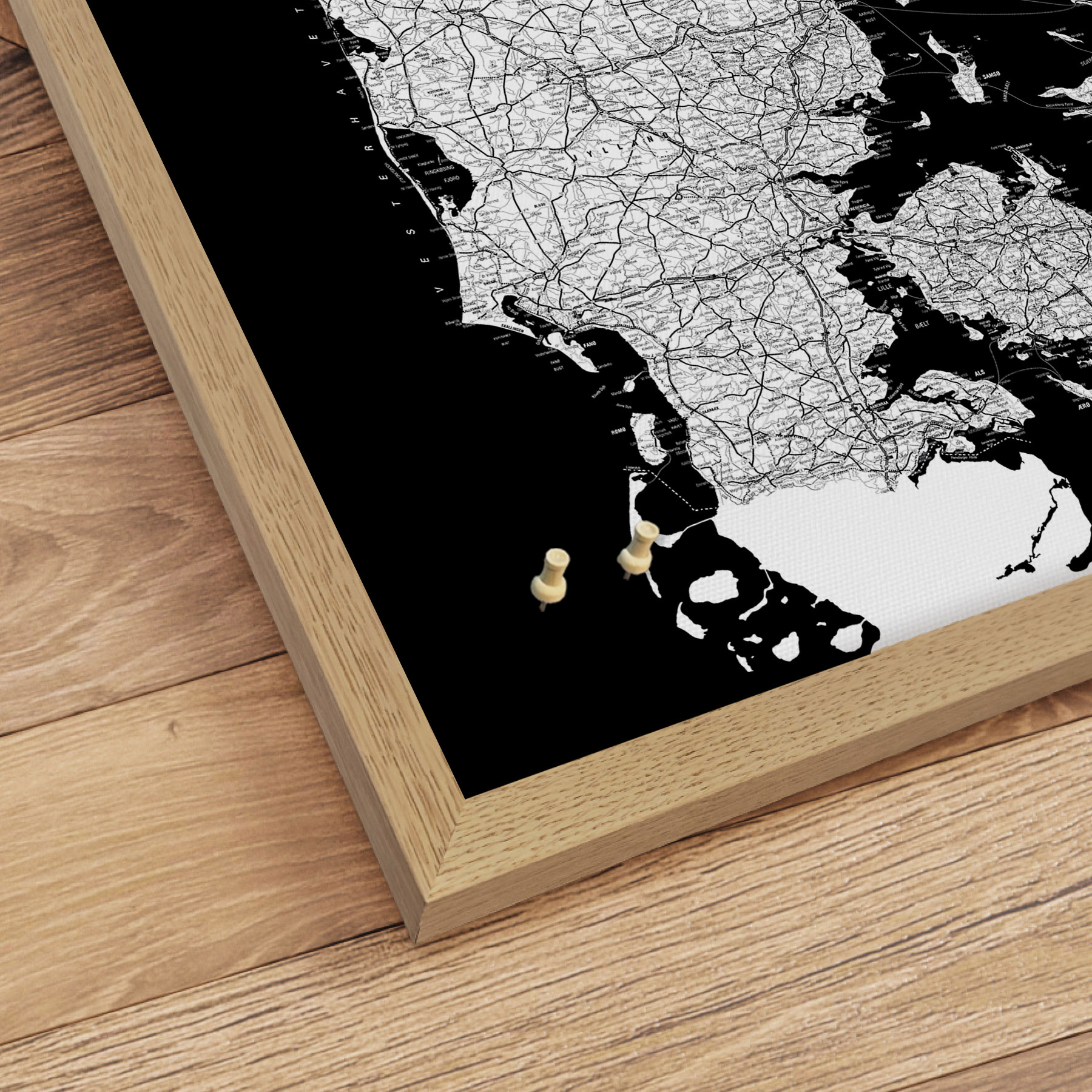 Kortet har en sort baggrund, der skaber en smuk kontrast til de hvide og grå detaljer, hvilket giver det et moderne og grafisk udtryk. Det er indrammet i en lys egetræsramme, der tilfører et nordisk touch og passer perfekt ind i enhver indretning.