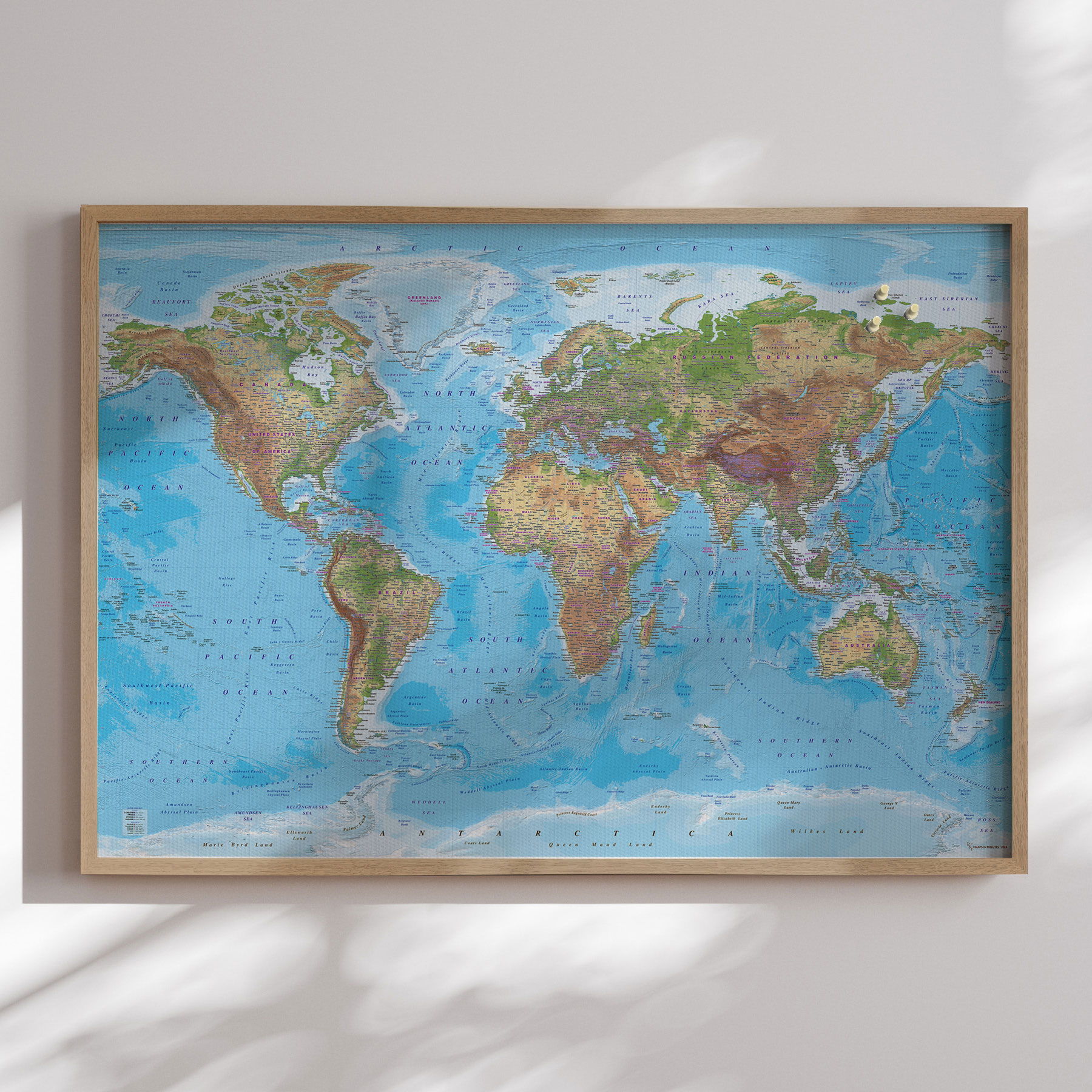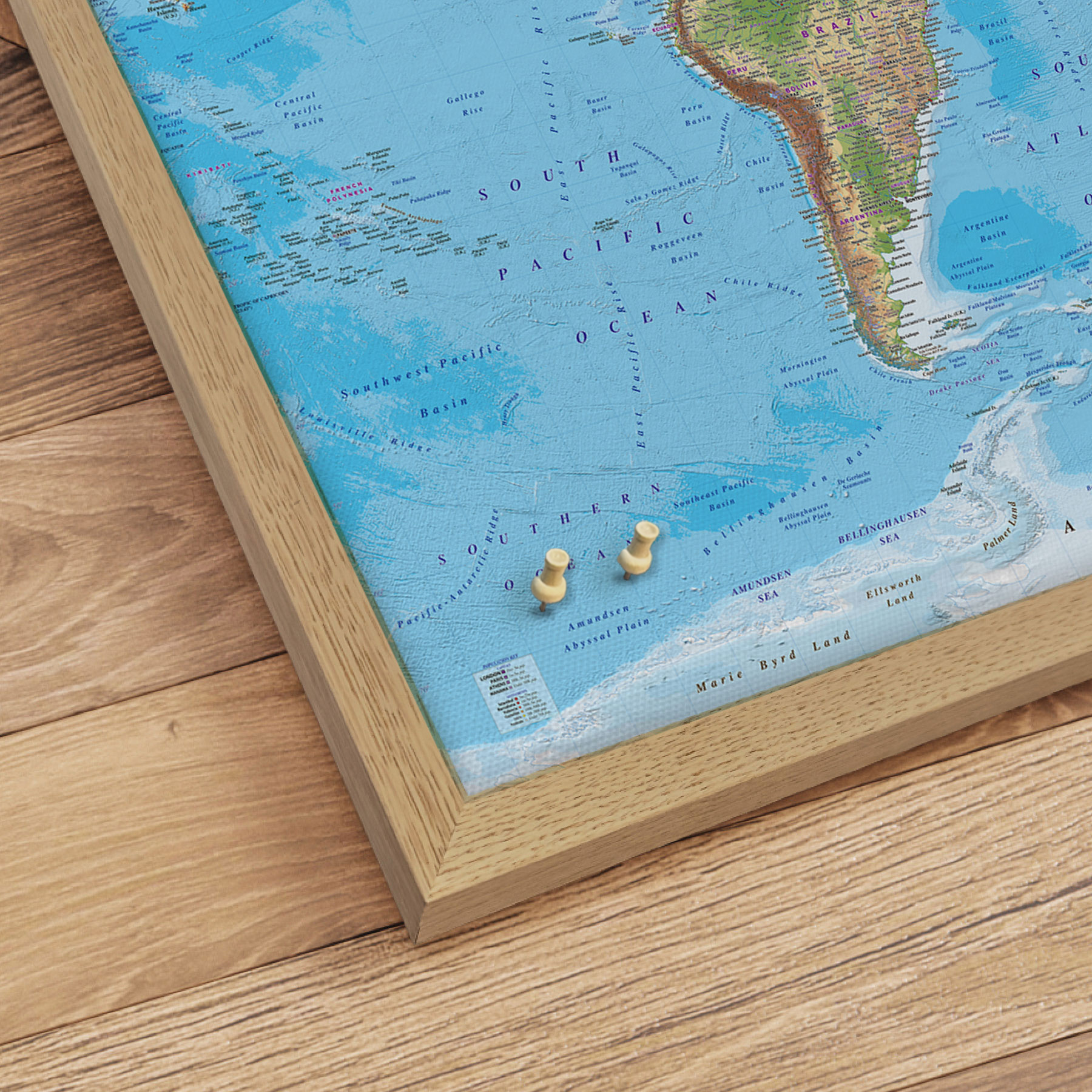 Den flotte egetræsramme giver et fantastisk udtryk, mens den matte overflade beskytter mod slid og refleksioner. Perfekt til hjemmet eller kontoret som en tidløs dekoration med geografisk præcision.