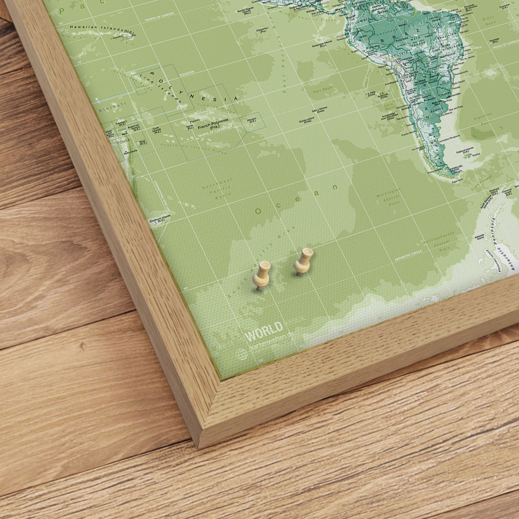 Den flotte egetræsramme giver et fantastisk udtryk, mens den matte laminerede overflade beskytter mod slid og refleksioner. Perfekt til hjemmet eller kontoret som en tidløs dekoration med geografisk præcision.
