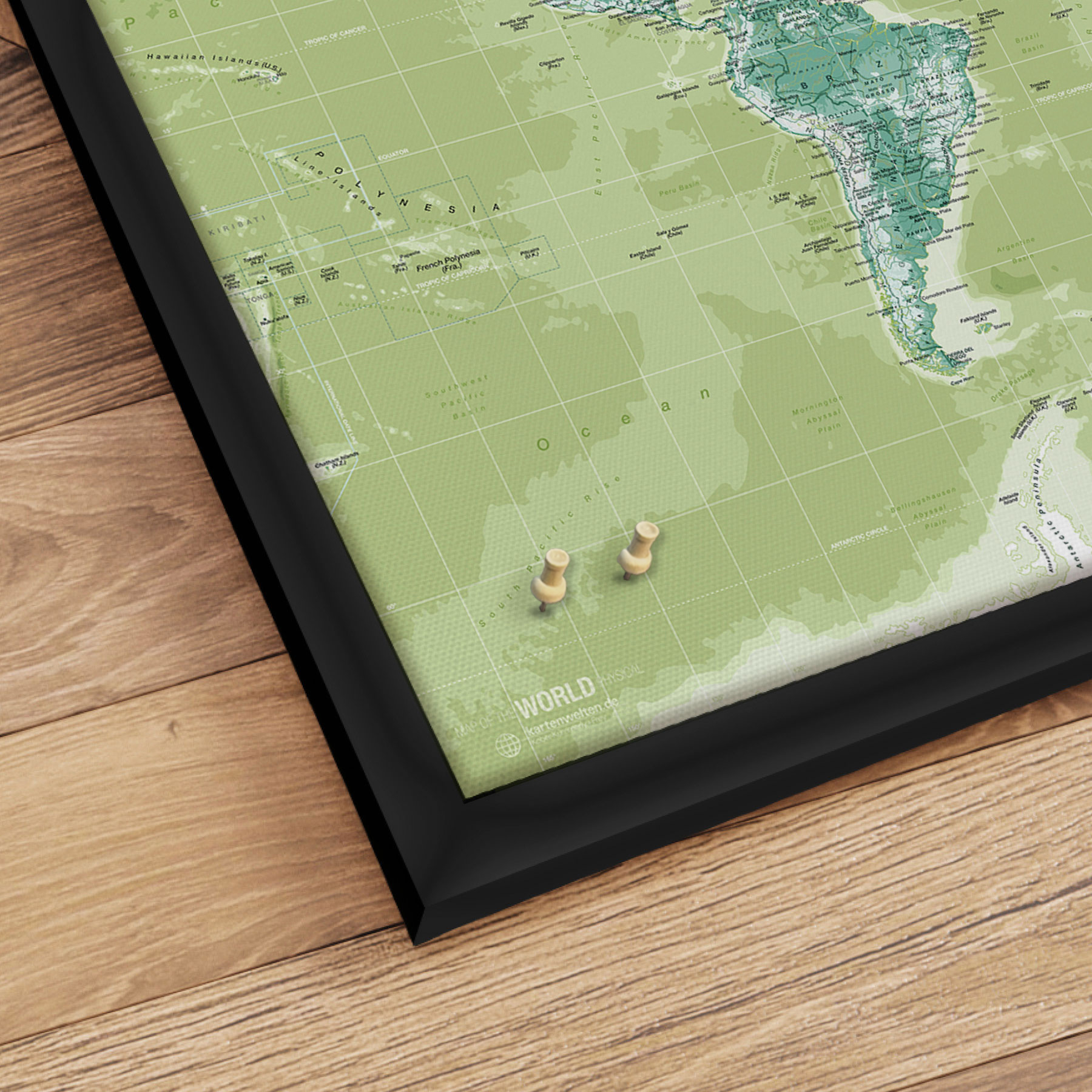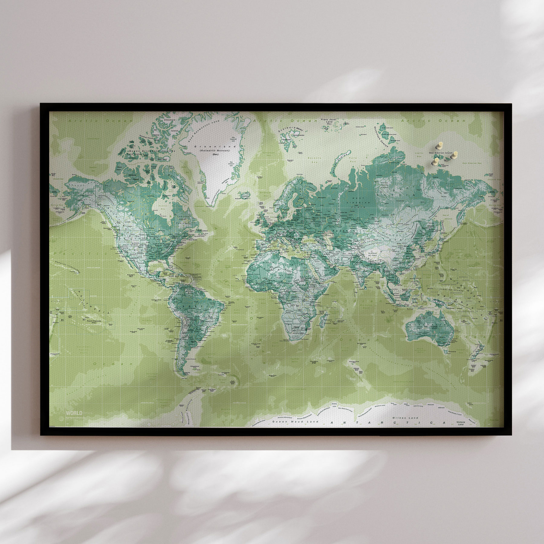 Et verdenskort som opslagstavle, i grønne toner, der forener vintage charme med moderne elegance. "Green" verdenskortet har en smuk balance mellem detaljerigdom og stilrent design, hvor konturerne af kontinenter og lande står tydeligt frem.