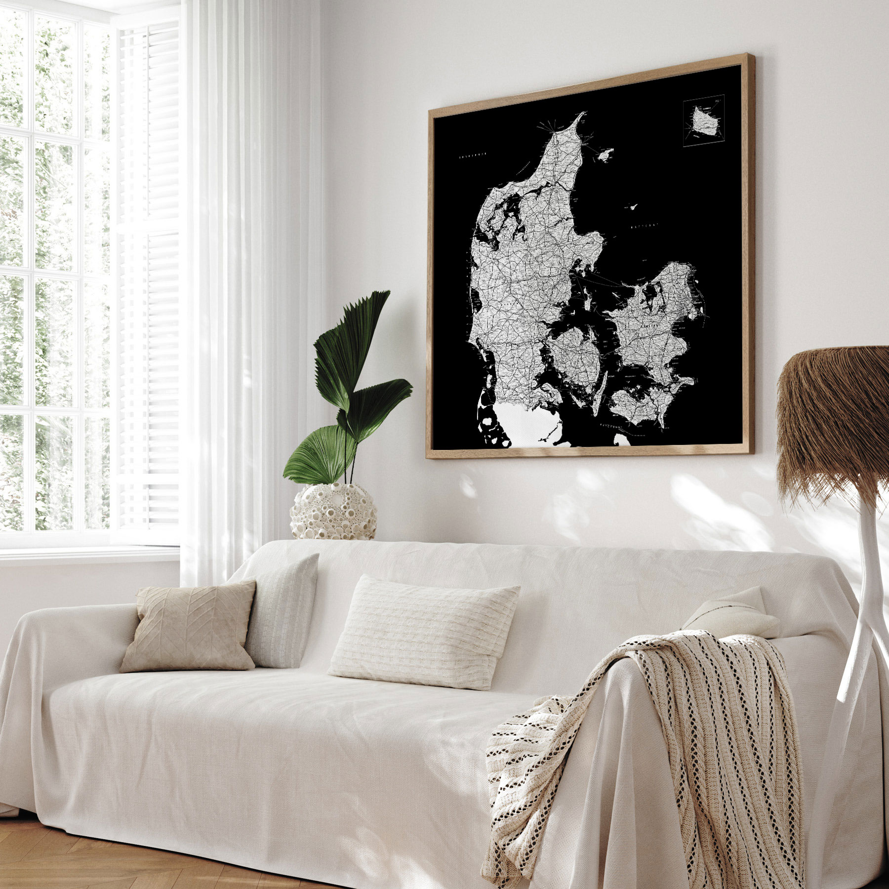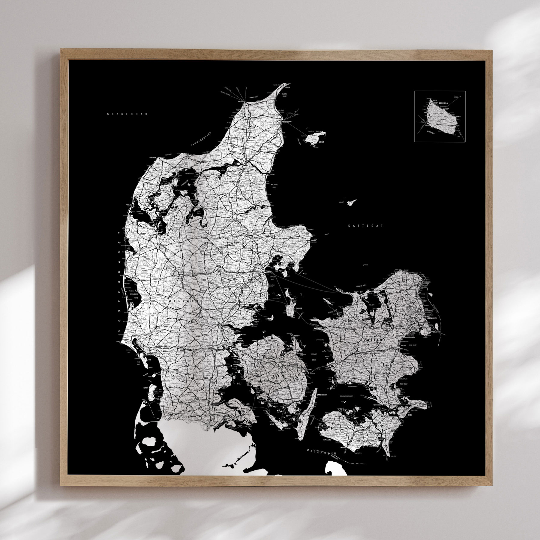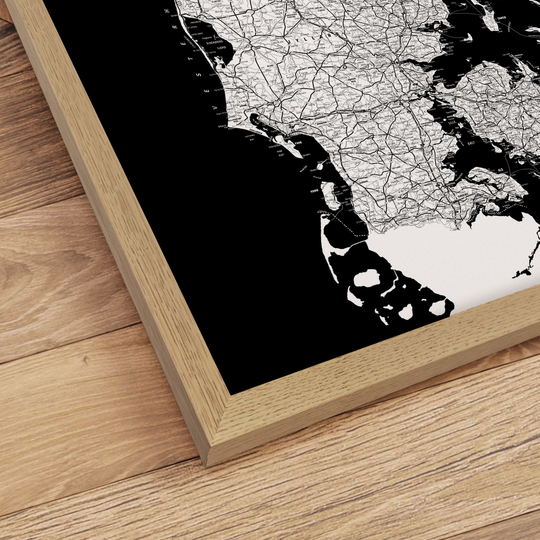 Få et stilfuldt og detaljeret kort over Danmark indrammet i en smuk egetræsramme. Denne moderne plakat fremhæver landets vejnet og topografi i et minimalistisk sort-hvidt design, der passer perfekt til ethvert hjem eller kontor.