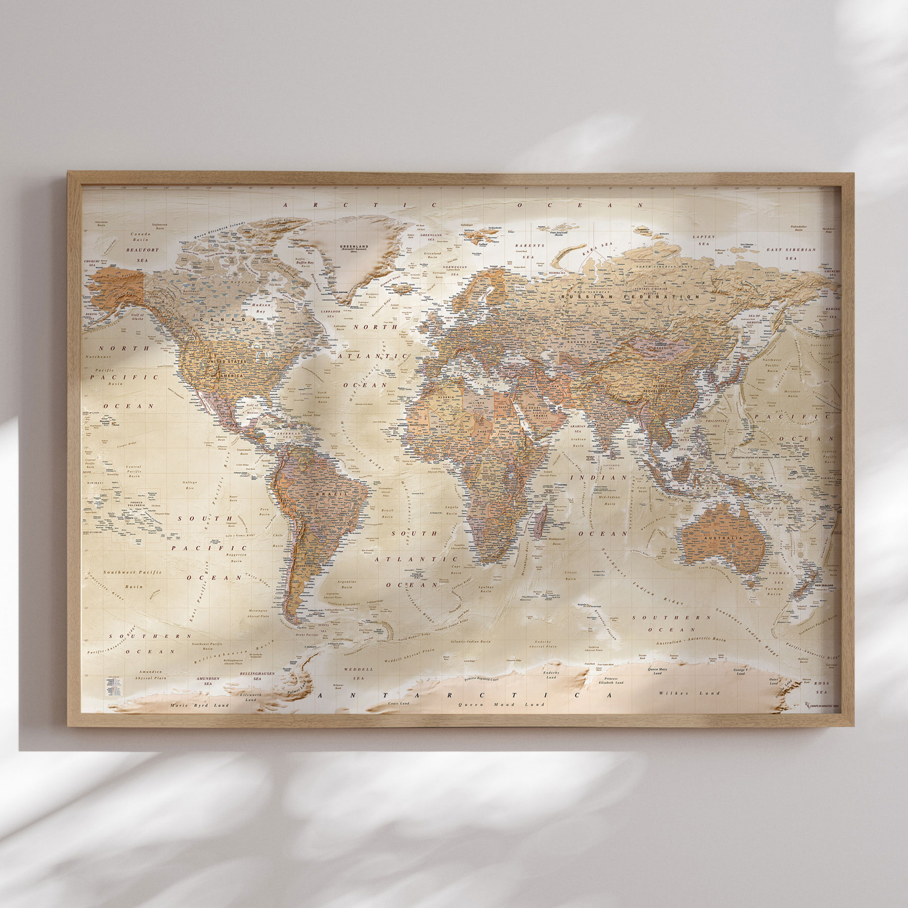 Lad varme, naturlige nuancer sætte tonen med "Sand" verdenskort, hvor jordfarver og bløde beige toner skaber en tidløs æstetik.