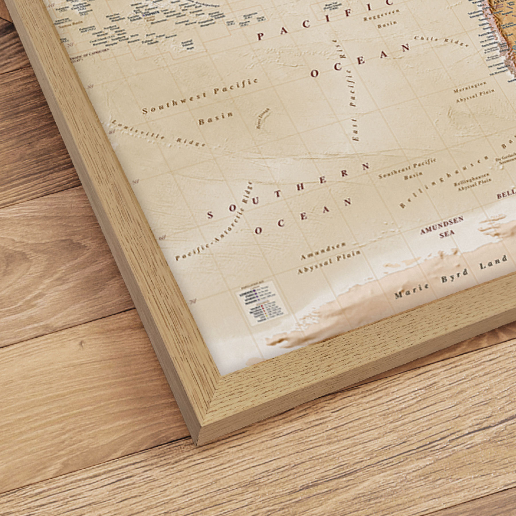 De fine detaljer i kortet bringer geografi til live, mens egetræsrammen tilføjer en organisk og elegant finish.