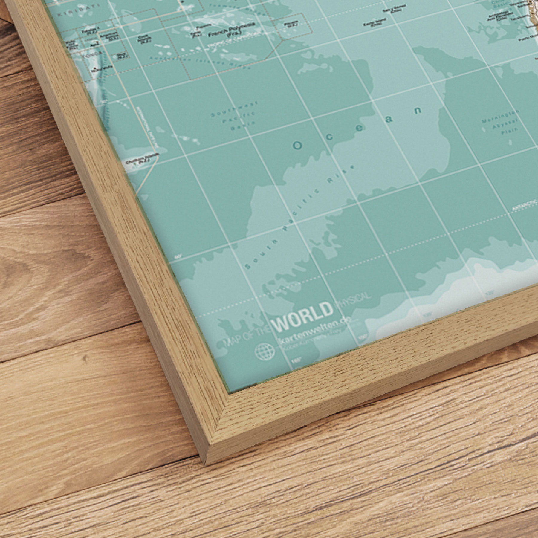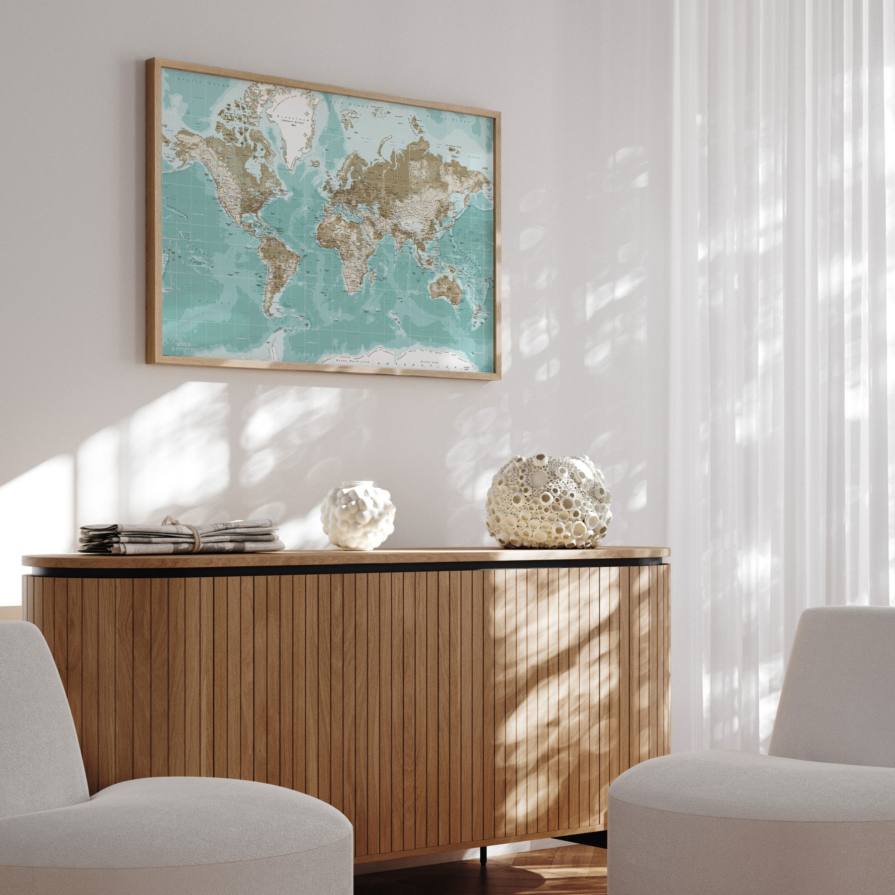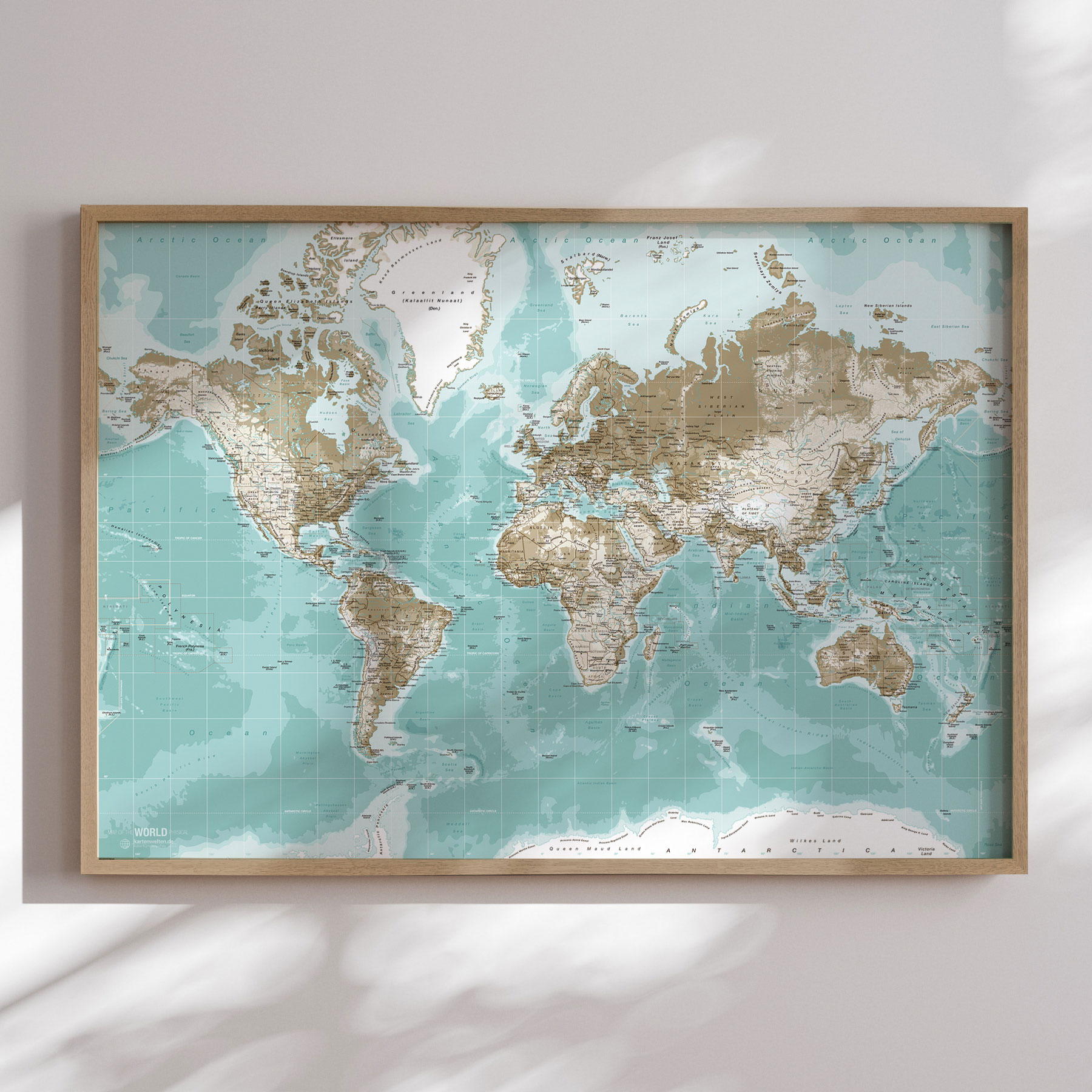 "Winter" verdenskort forener kølige blå toner med jordfarvede kontinentlinjer, hvilket skaber en elegant og rolig atmosfære. De subtile farvenuancer giver kortet et let og luftigt udtryk, mens de fine geografiske detaljer gør det både dekorativt og informativt. Den varme egetræsramme tilfører en naturlig kontrast, og den matte laminerede overflade beskytter mod reflekser og slid. Et stilfuldt valg til både hjemmet og kontoret.